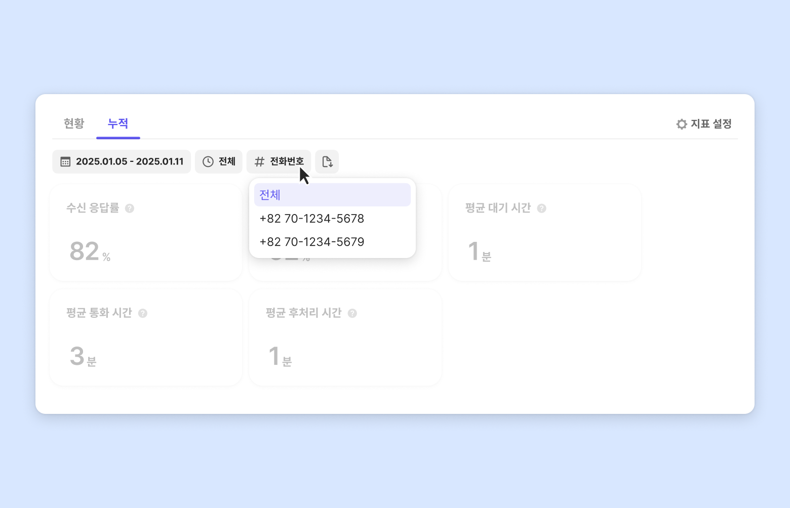 지정한 기간동안 누적된 전화 통계를 볼 수 있는 대시보드 입니다.