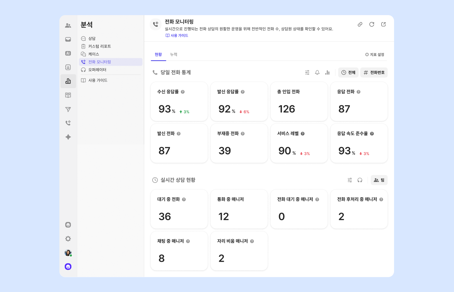 실시간으로 대기 중인 콜 수, 통화중인 상담원 수를 비교해보면서 상담인원을 조정하거나 전화 상담을 효율적으로 운영해 보세요.