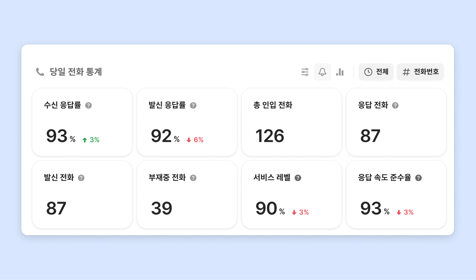 총 인입 전화: 오늘 총 인입된 전화의 수로, 응답 전화와 부재중 전화의 합산입니다.