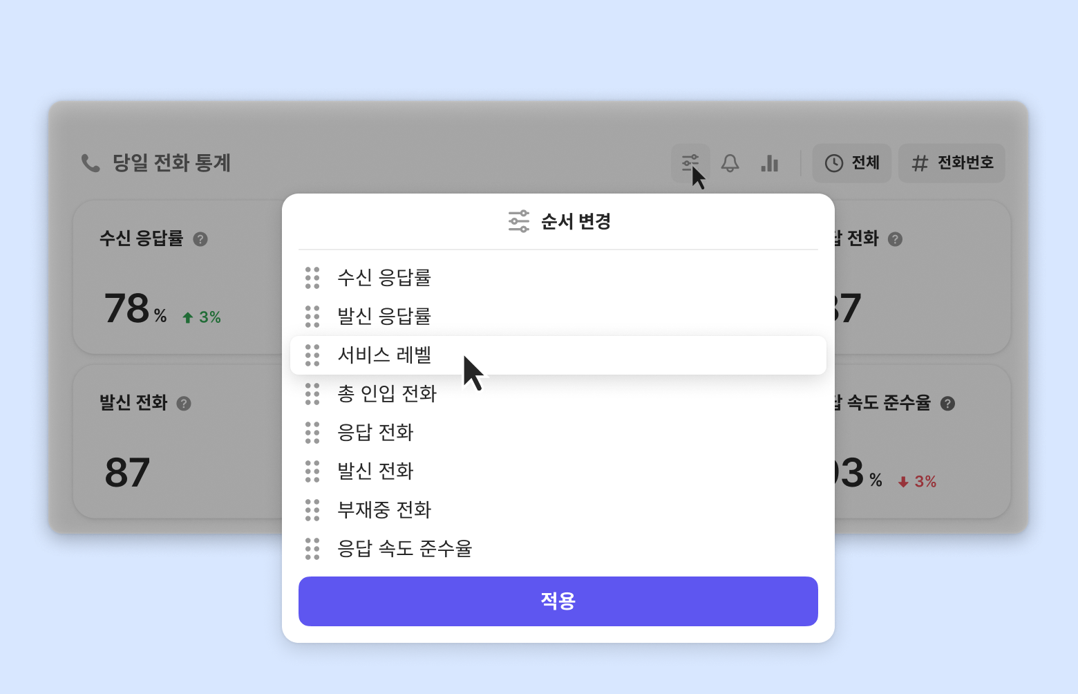 서비스 레벨: 고객이 전화 연결 대기를 시작한 후, 목표 시간 내에 상담원이 전화를 받은 비율입니다.