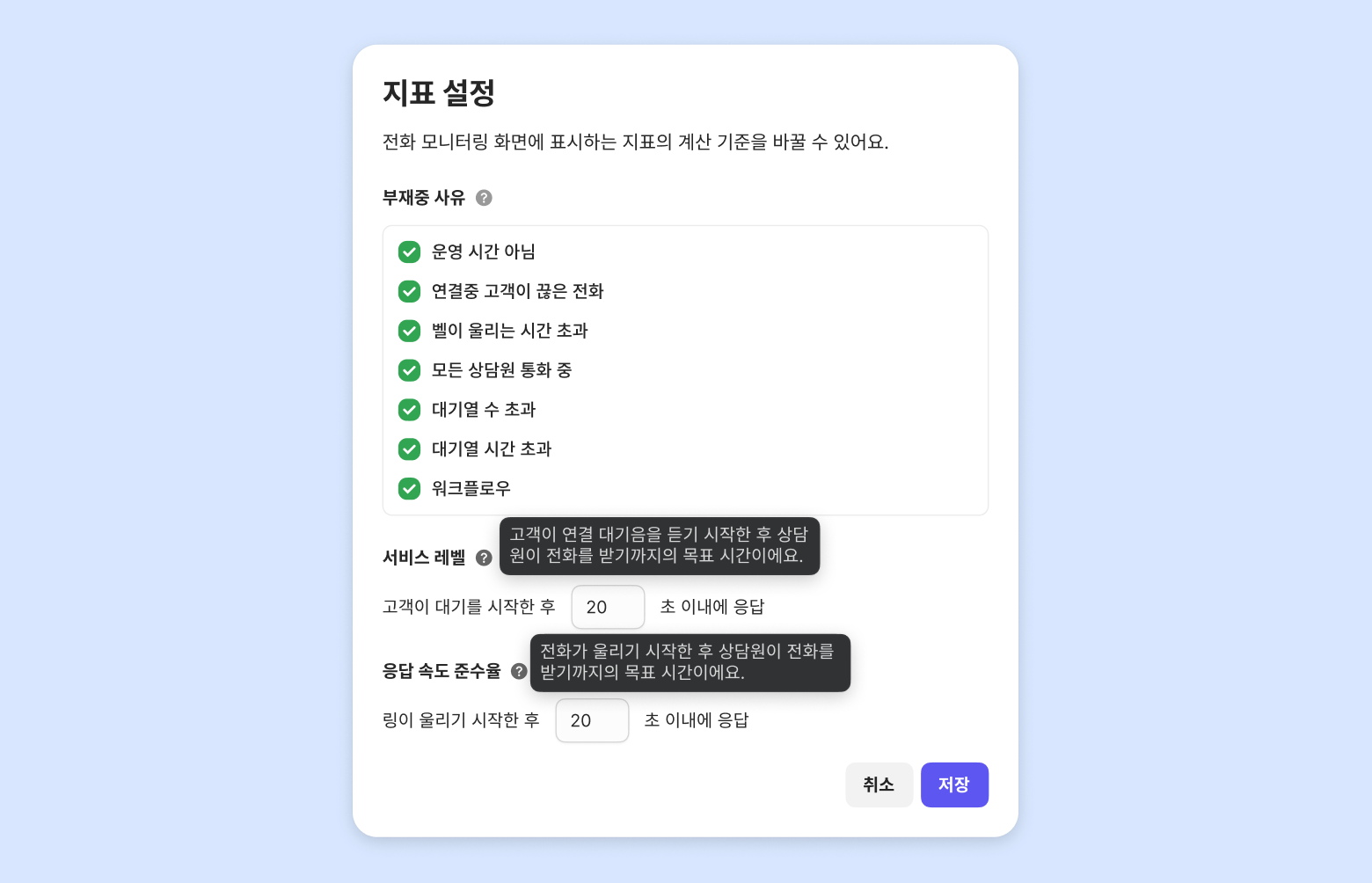 부재중 전화의 사유 별 통계 포함 여부와 서비스 레벨 및 응답 속도 준수율의 목표 시간을 설정할 수 있어요.