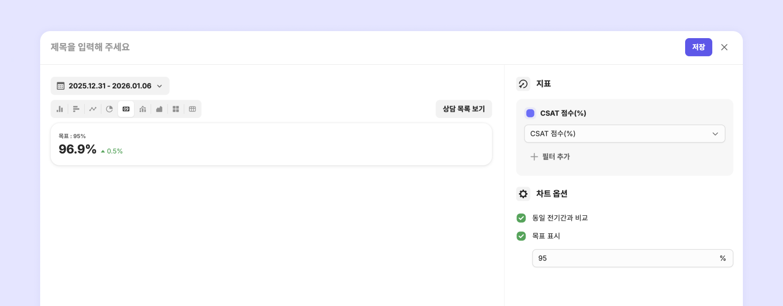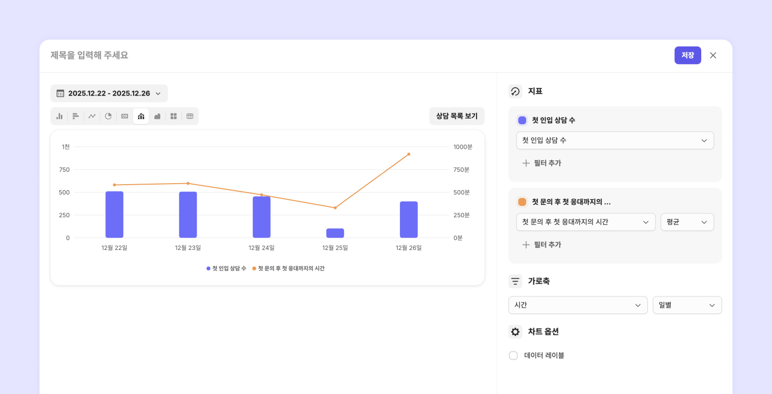 지표: 인입된 상담 수, CSAT 점수(%), 평균 응답 시간 (미운영 시간 제외), 담당자 배정 후 첫 응대까지의 시간 (미운영 시간 제외)