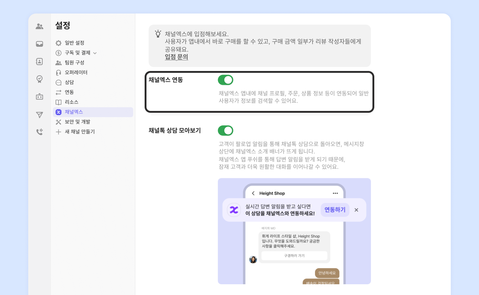 채널톡 상담 모아보기를 ON으로 설정하면, 자사몰 상담창을 떠난 경우에 발송되는 팔로업 알림 상단에 채널엑스 연동 배너가 뜨게 됩니다.