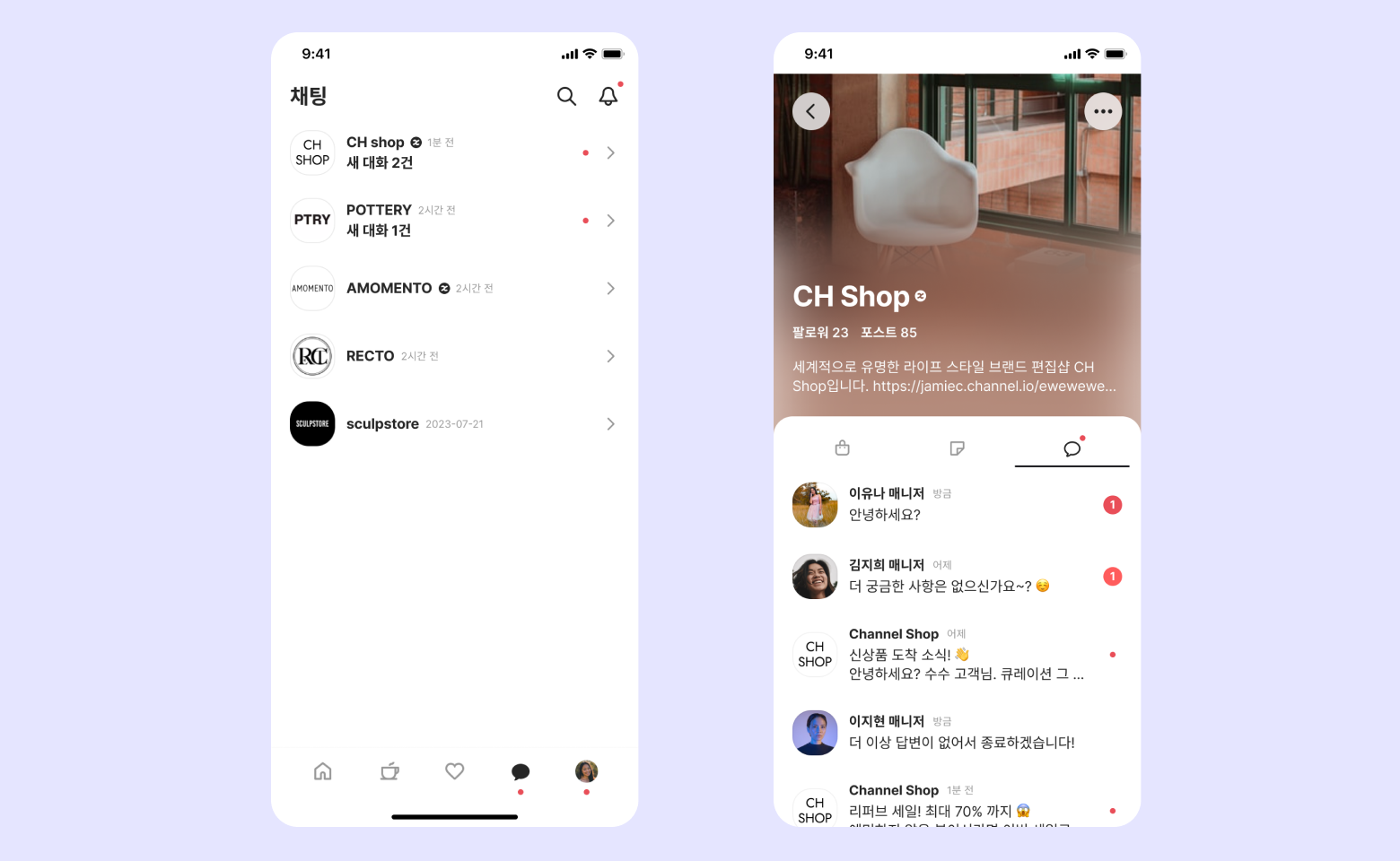 배너를 통해 고객이 채널엑스 앱을 설치해 상담을 연동하게 되면, 자사몰 채널톡에서 나눈 상담이 채널엑스 앱 내 [마이페이지] - [채팅]에 연동됩니다. 고객은 언제든지 채널엑스 앱에서 상담을 확인할 수 있어요.