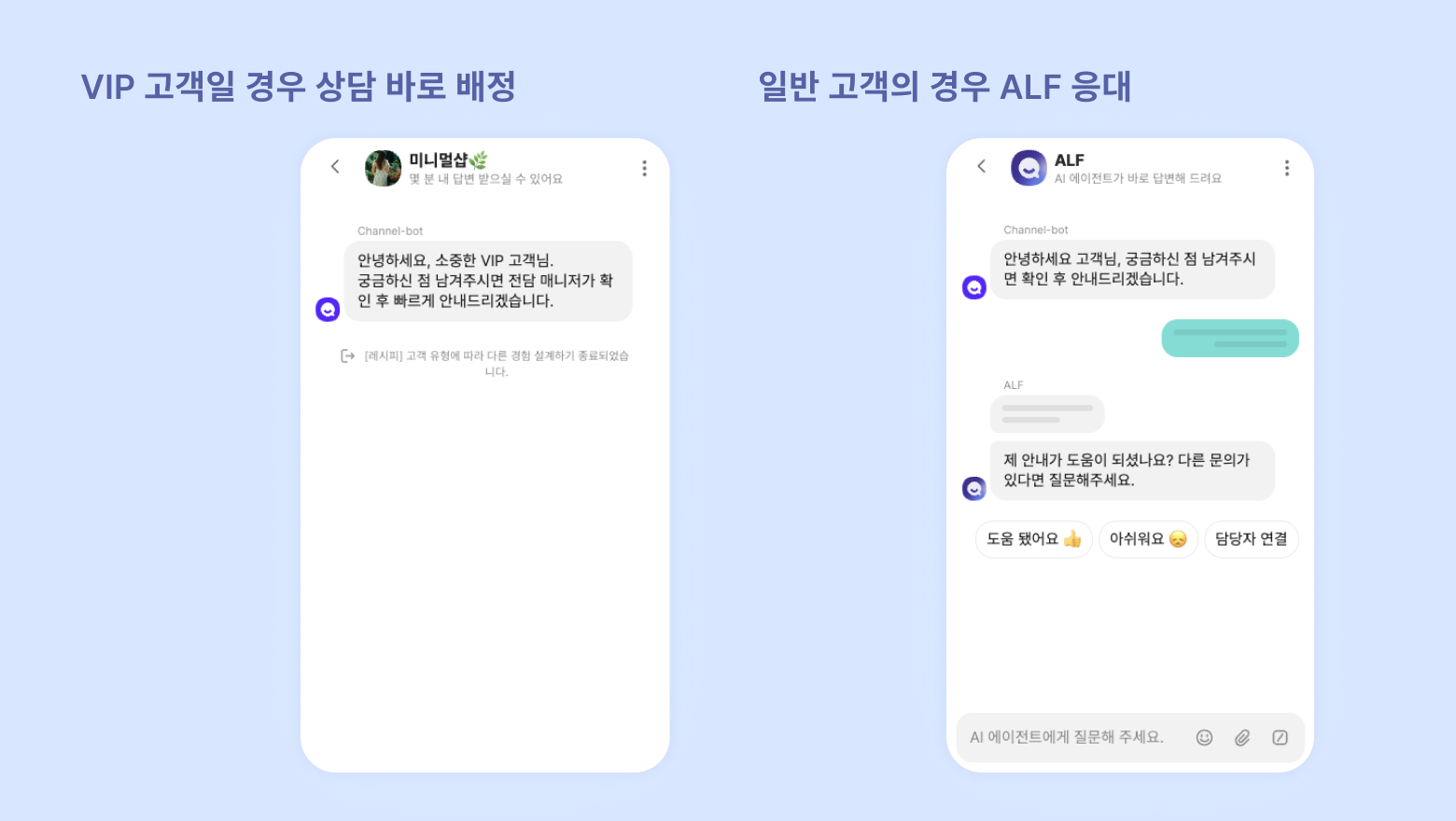 단골에게는 핫라인 상담 창구로 즉각적인 응대를, 모수가 많지만 객단가가 낮은 신규 고객에게는 단순하고 반복적인 문의 해결을 위해 ALF가 자주 묻는 질문을 먼저 응대하도록 설정할 수 있어요.