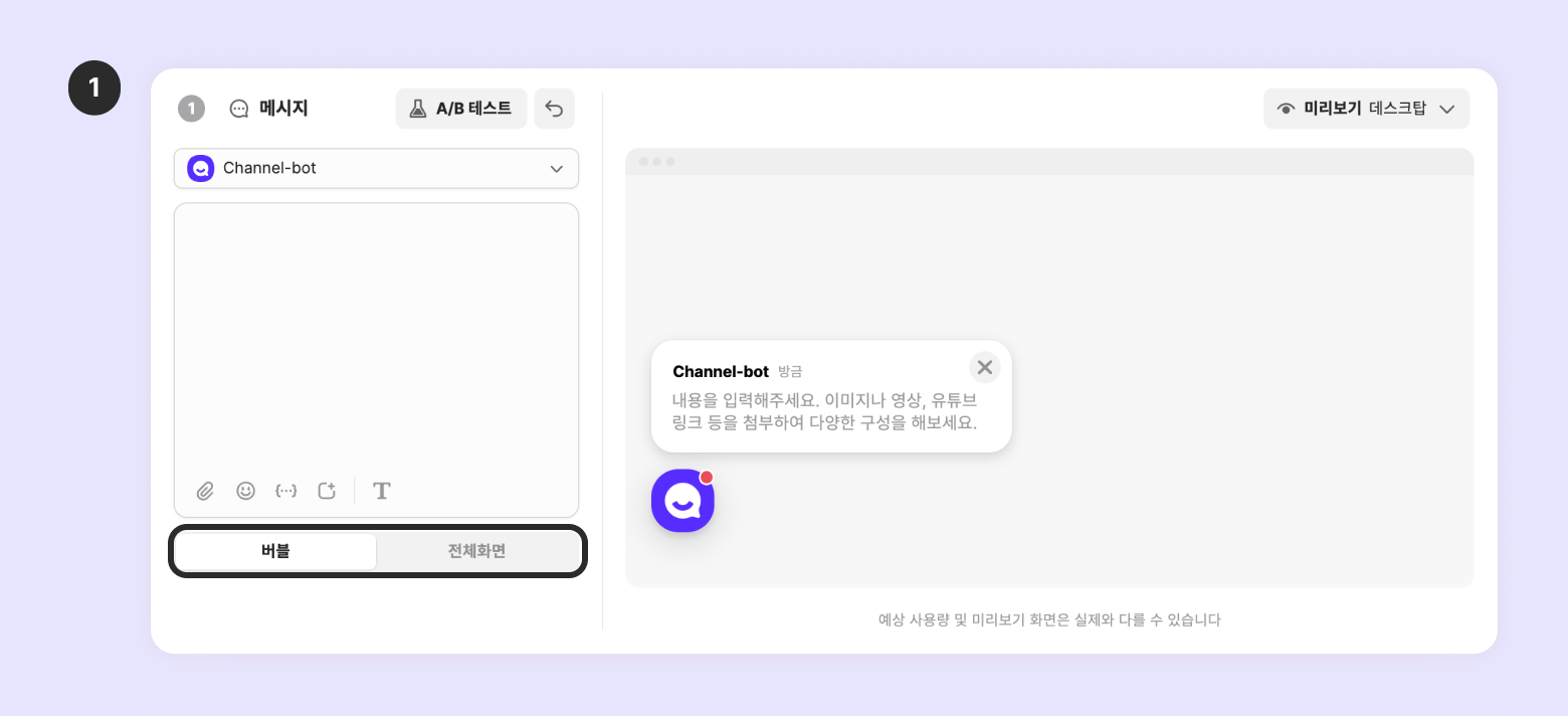 원하는 메시지를 입력합니다. 하단에 말풍선으로 표시되는 버블과 전체화면 중 선택할 수 있어요.