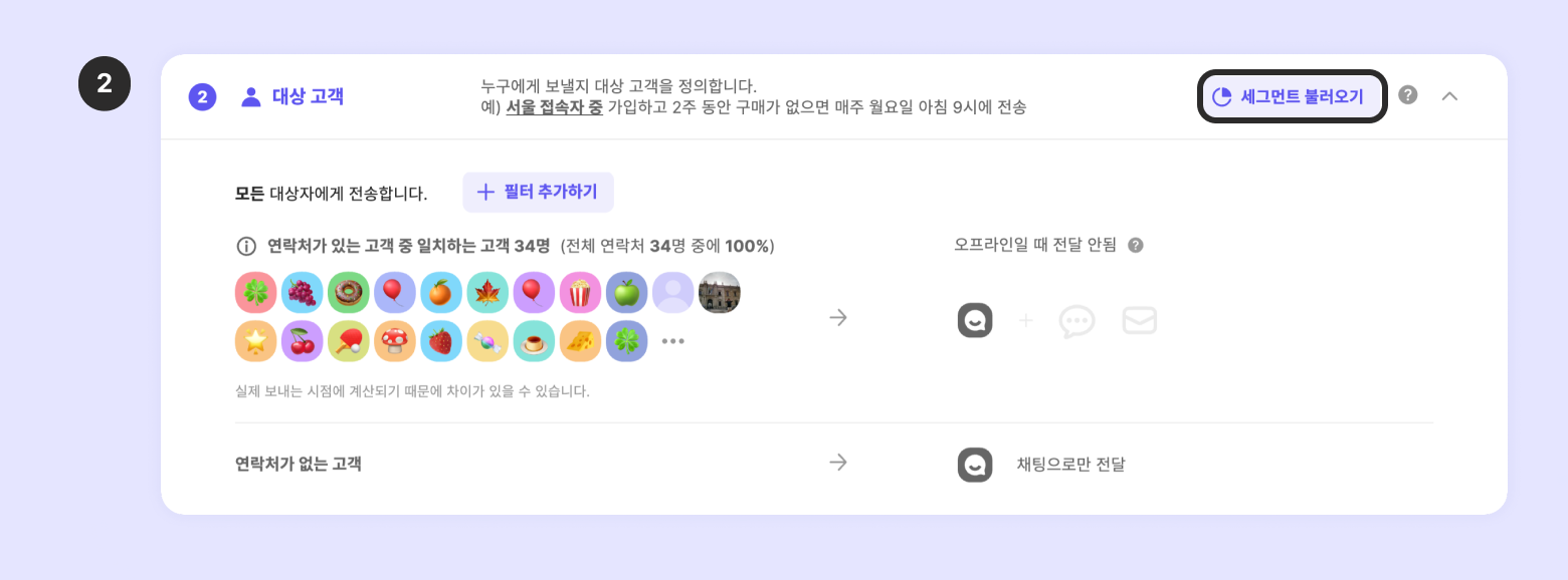 대상 고객을 모든 대상자로 설정해요. 만약 특정 세그먼트가 있다면 클릭 후 [세그먼트 불러오기]를 할 수 있어요.