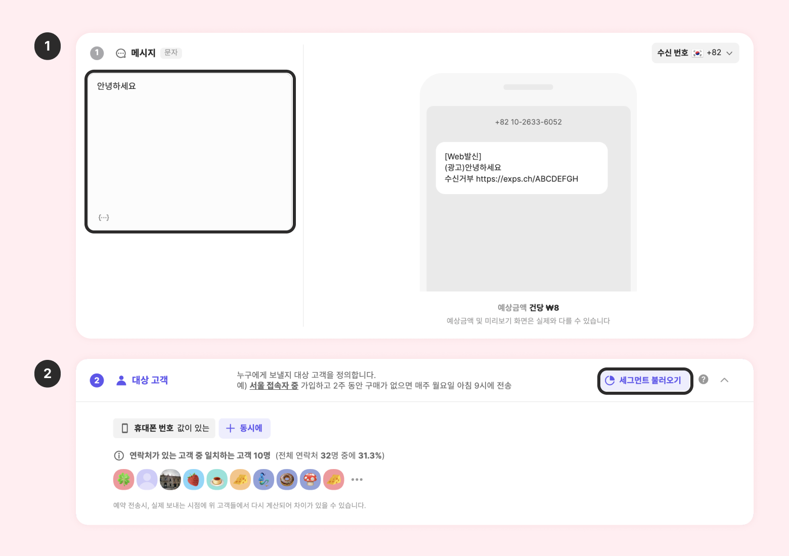 대상 고객은 기본적으로 [휴대폰 번호 값이 있는]으로 선택되어 있어요. 만약 추가할 특정 세그먼트가 있다면 클릭 후 [세그먼트 불러오기]나, [+ AND 조건 추가]를 눌러 조건을 추가해주세요.