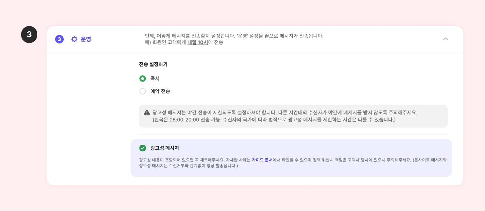 광고성 메시지가 들어가는 경우는 광고성 메시지를 반드시 체크해주세요. 맨 앞의 (광고)와 수신 거부 링크가 함께 전송됩니다.