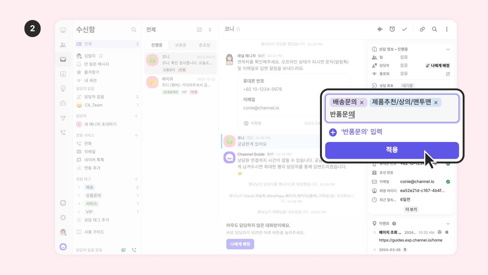 [수신함] → [상담 정보] → [상담 태그] 선택에서 추가