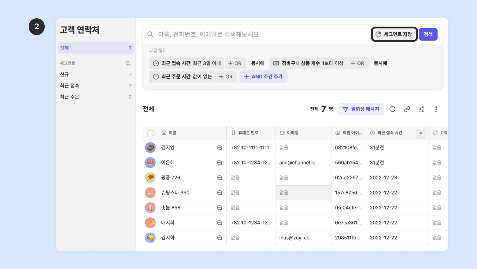 세그먼트는 검색된 고객의 목록을 저장하는게 아닌, 필터링 조건을 저장합니다. 같은 세그먼트여도 일주일 전과, 일주일 후의 대상 고객이 달라질 수 있어요.