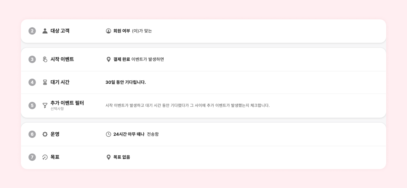 위 예시에서 추가 이벤트 필터에 [결제 완료가 발생하지 않았을 때]를 설정하시면, 구매 후 30일 동안 추가 구매가 없는 고객을 타겟으로 메시지를 보낼 수 있어요.