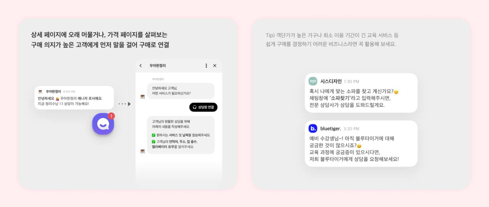 상세 페이지에 오래 머물거나, 여러 페이지를 살펴보는 고객에게는 먼저 말을 걸어 상담을 유도해보세요.