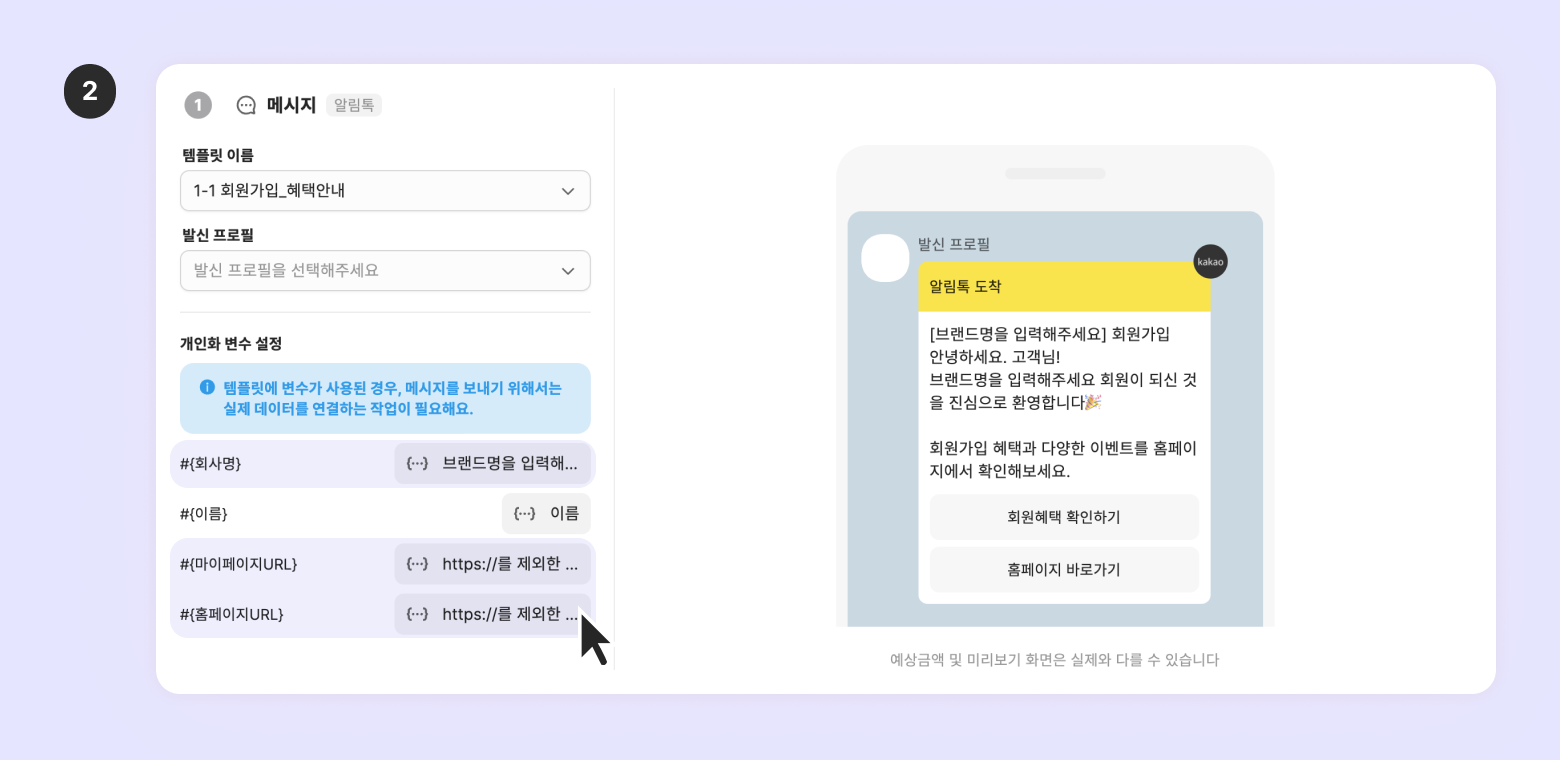 원하는 메시지를 입력합니다. 오른쪽에서 미리보기 화면으로 내용을 확인할 수 있어요.