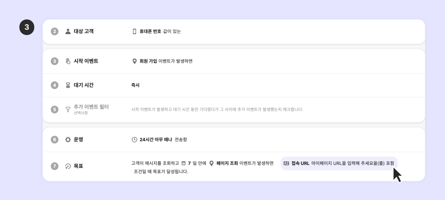 레시피에 적용된 내용은 예시입니다. 서비스에 맞게 자동 메시지, 태그 등을 수정하여 이용해주세요.