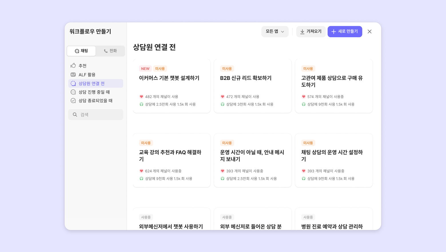 [워크플로우] - [+ 워크플로우 만들기]에서 상담 목적에 맞는 레시피를 선택해, 클릭 한 번으로 설정을 시작해보세요. 채팅/전화 상담용 레시피가 구분되어 있고, 상담 단계별로 다양한 템플릿이 준비되어 있어요.