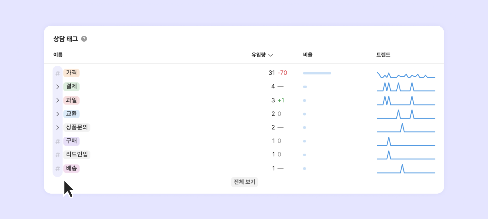 상담 태그 항목에서 설정한 기간동안 어떤 태그가 붙은 상담이 들어왔는지 확인할 수 있어요. 결제/취소문의처럼 2단계의 태그라면, 결제 옆 > 버튼을 눌러 하위 태그의 숫자까지 확인이 가능해요.