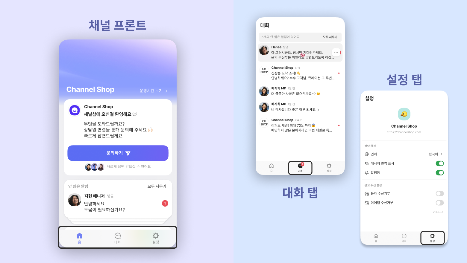 고객이 채널톡 버튼을 눌렀을 때 처음 보이는 화면을 ‘채널 프론트’ 라고 해요. 채널 프론트는 총 3개의 탭(홈 탭/ 대화 탭/ 설정 탭)으로 구분되어 있어요.