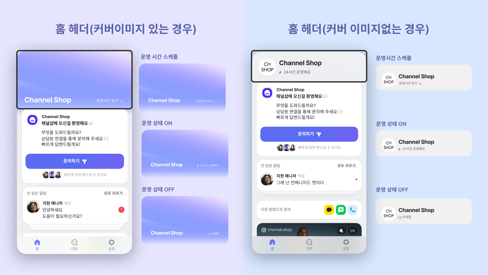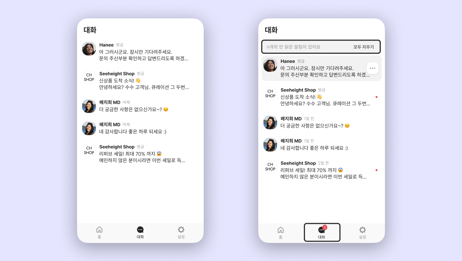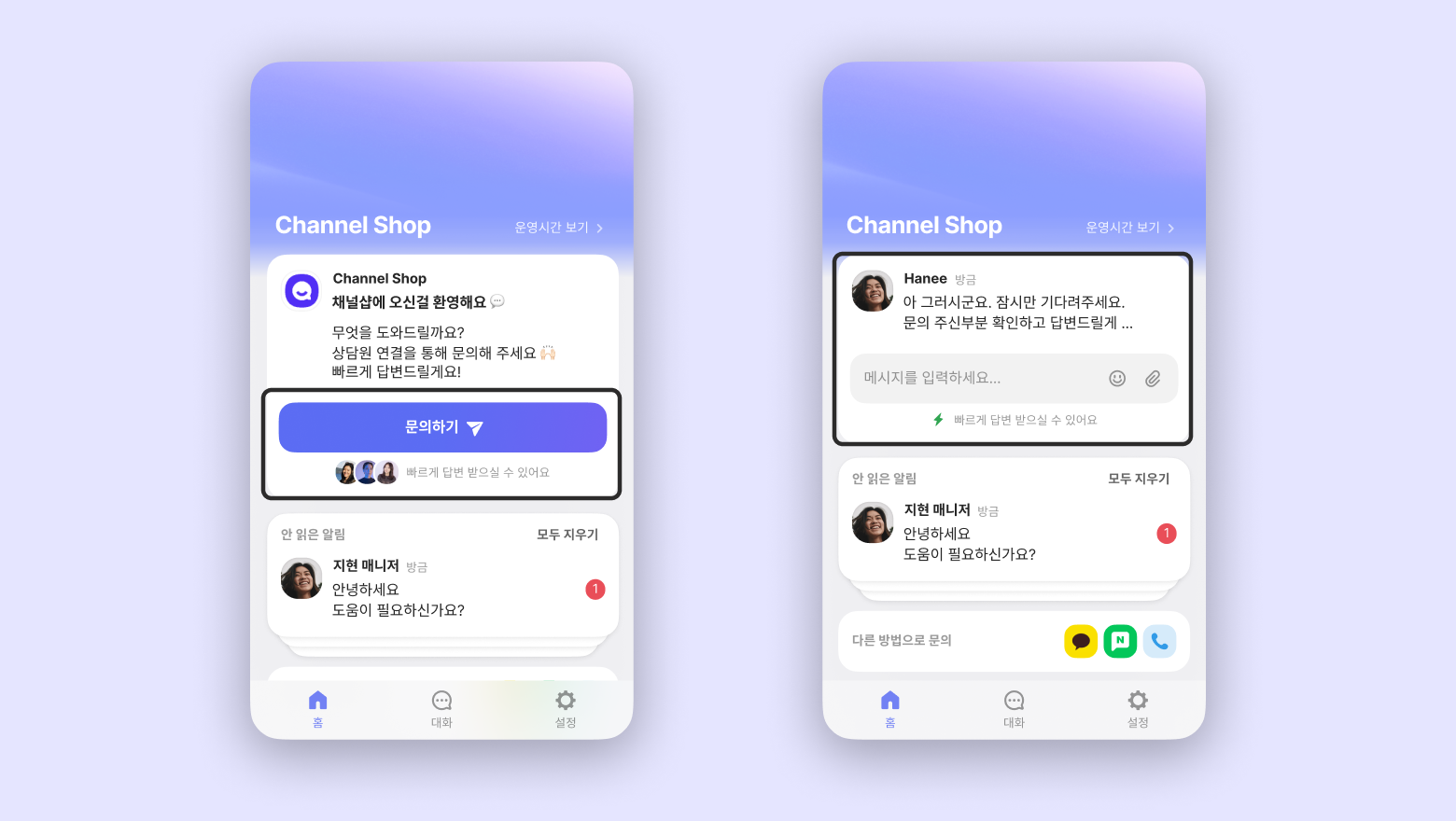 안 읽은 메시지가 있을 경우 안 읽음 알림 상담 창도 홈 탭에 함께 보입니다.