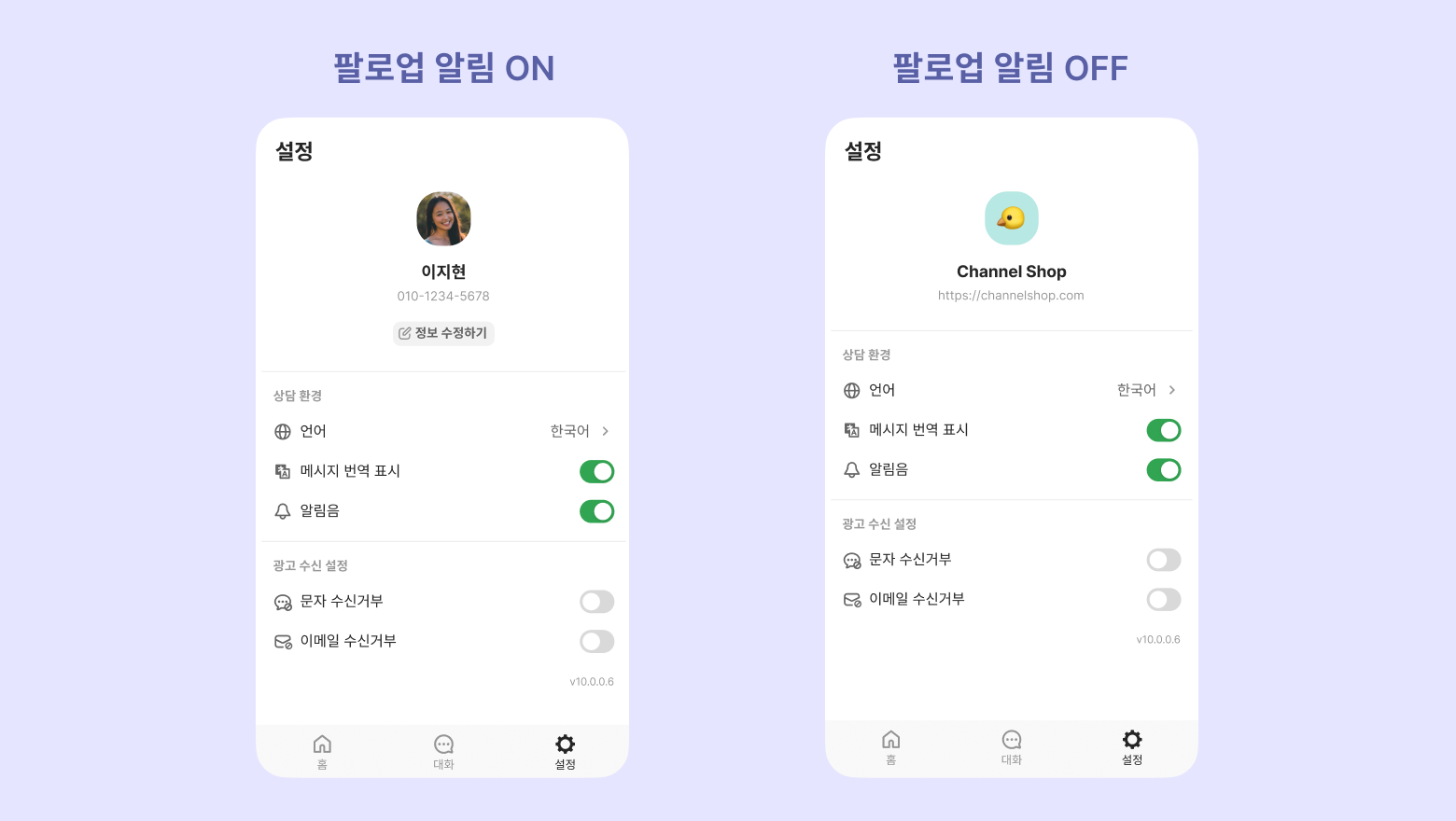 팔로업 알림 On / Off 설정 여부에 따라 고객에게 보여지는 설정 탭의 프로필 정보가 달라요.