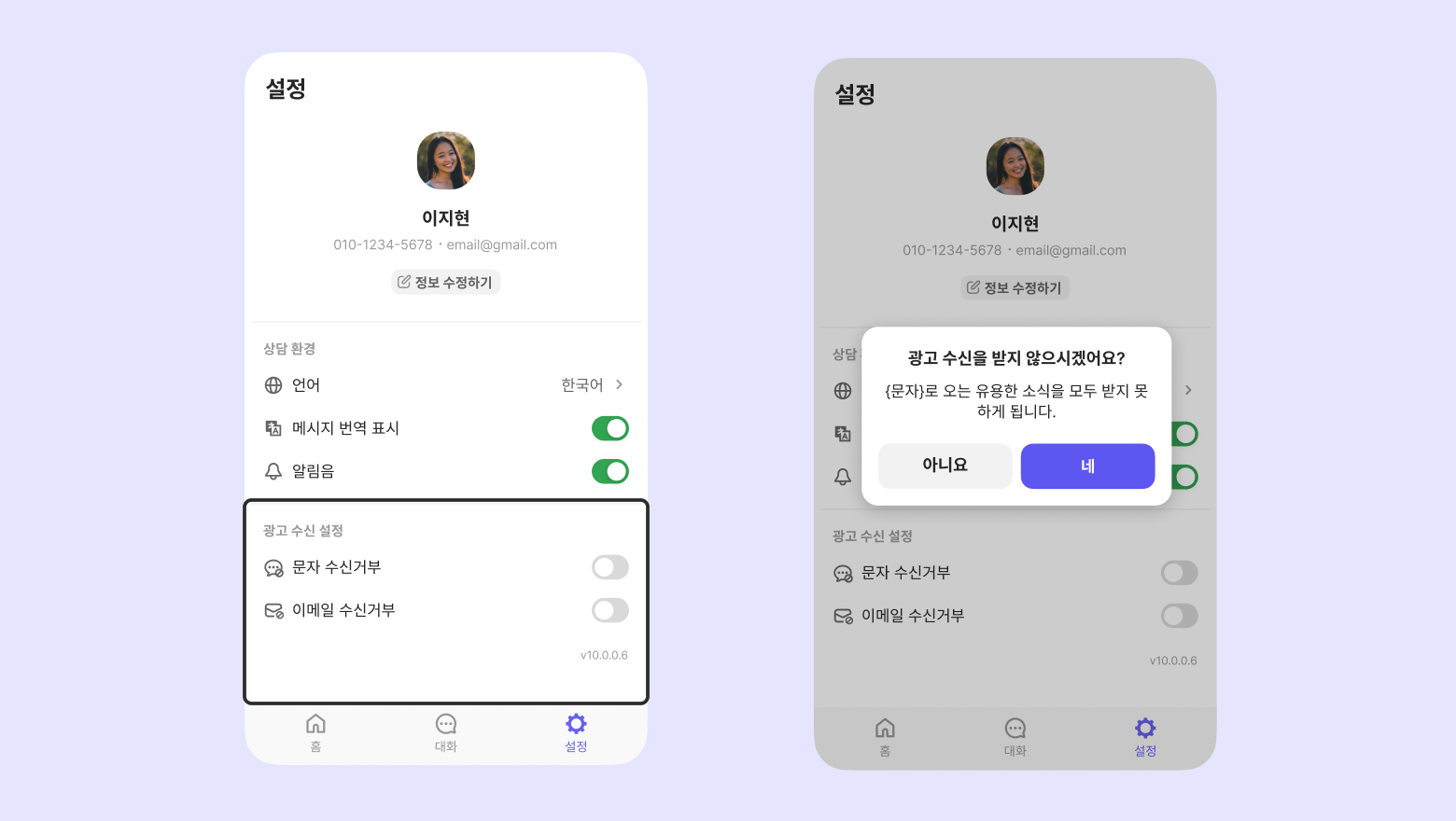 고객이 상담 환경 및 광고 수신 여부를 직접 설정할 수 있어요.