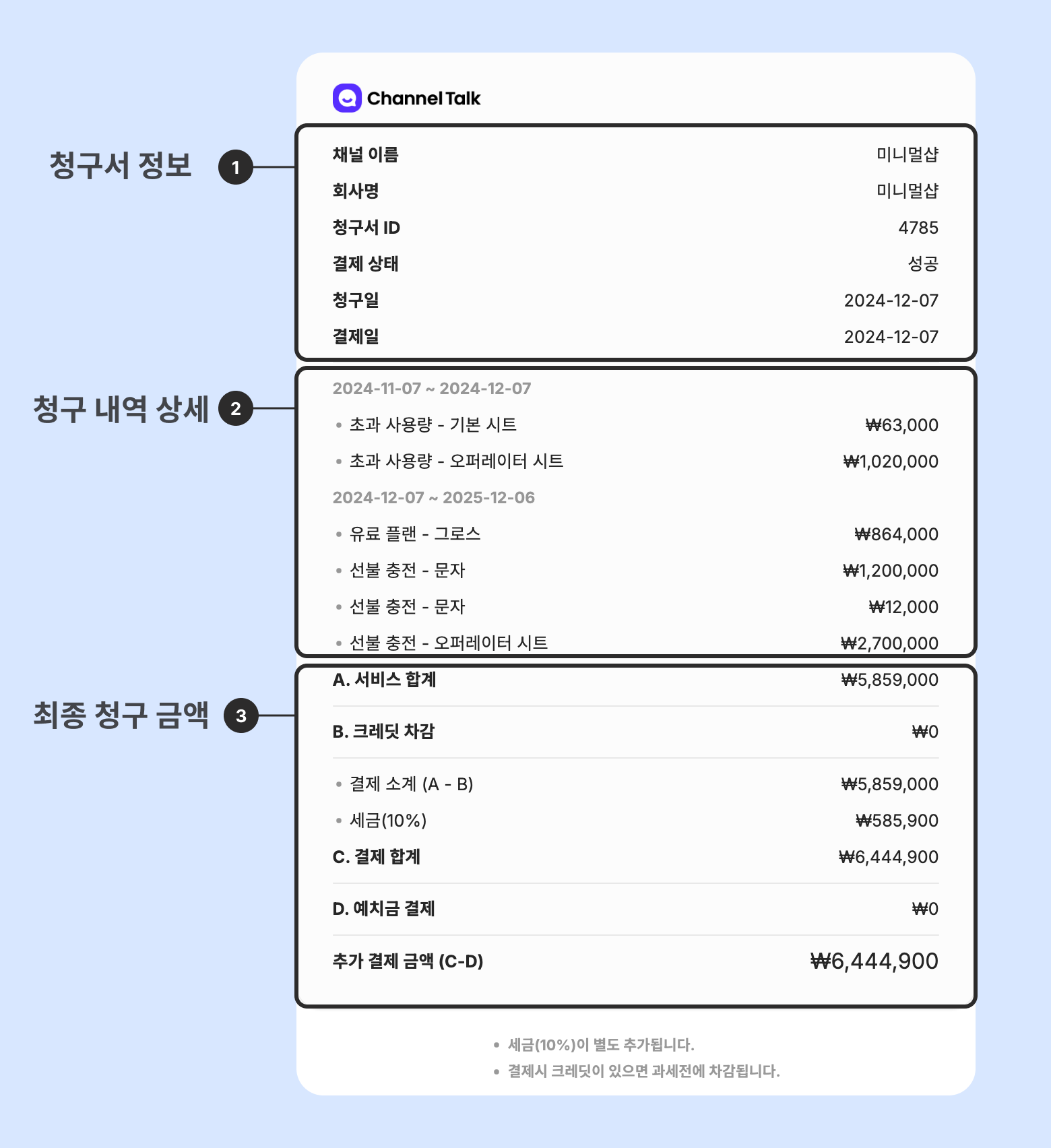 회사명: [채널 설정] - [구독 및 결제] - [결제 정보] - [결제용 회사 정보] 에 상호명을 입력한 경우, 입력한 상호명이 표시됩니다.