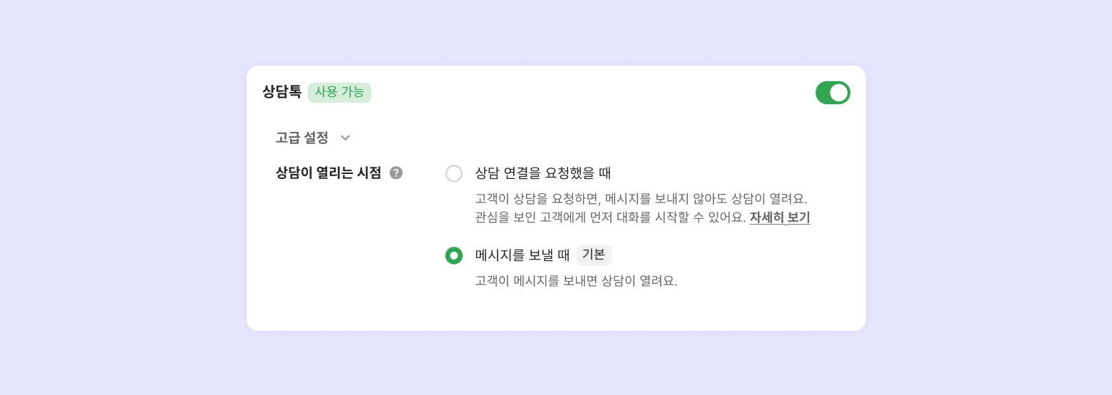 상담톡 고급 설정을 통해 상담이 열리는 시점을 선택할 수 있습니다. 단, 고급 설정과 관계없이 새 상담을 시작할 때 챗봇 또는 ALF 빠른 배포가 동작하도록 설정된 경우에는 상담이 바로 열리지 않고 준비중 상태에서 새 상담을 시작할 때 챗봇 또는 ALF가 동작합니다.