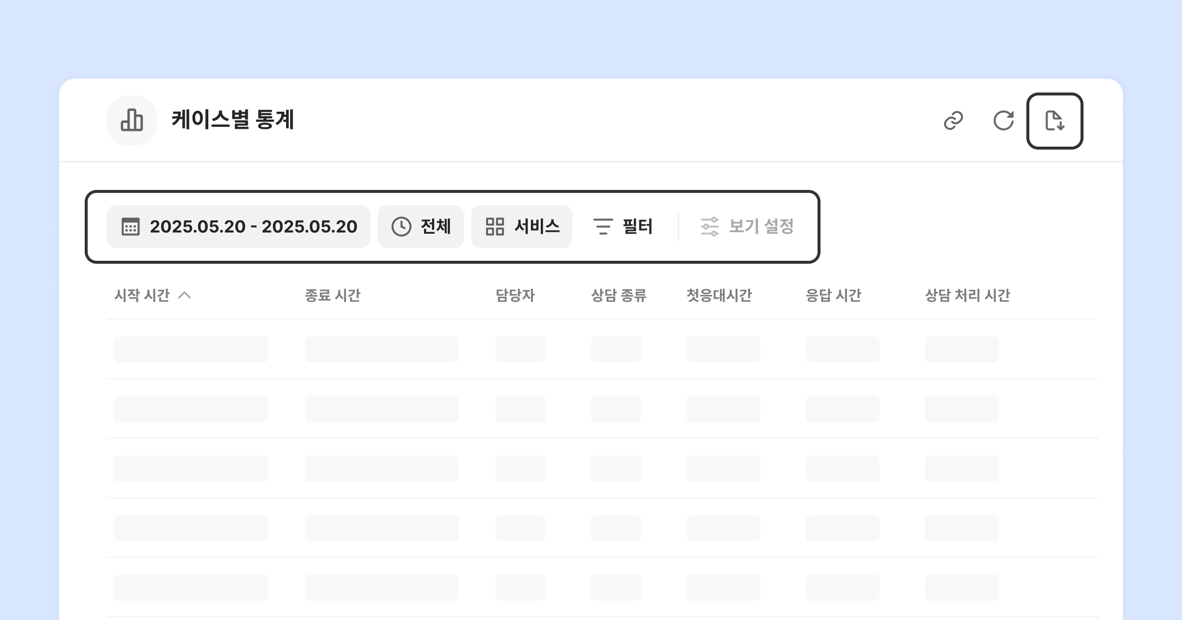 케이스별 통계 대시보드에서 원하는 조건으로 필터링하면, 해당 조건이 그대로 반영된 파일이 다운로드됩니다.