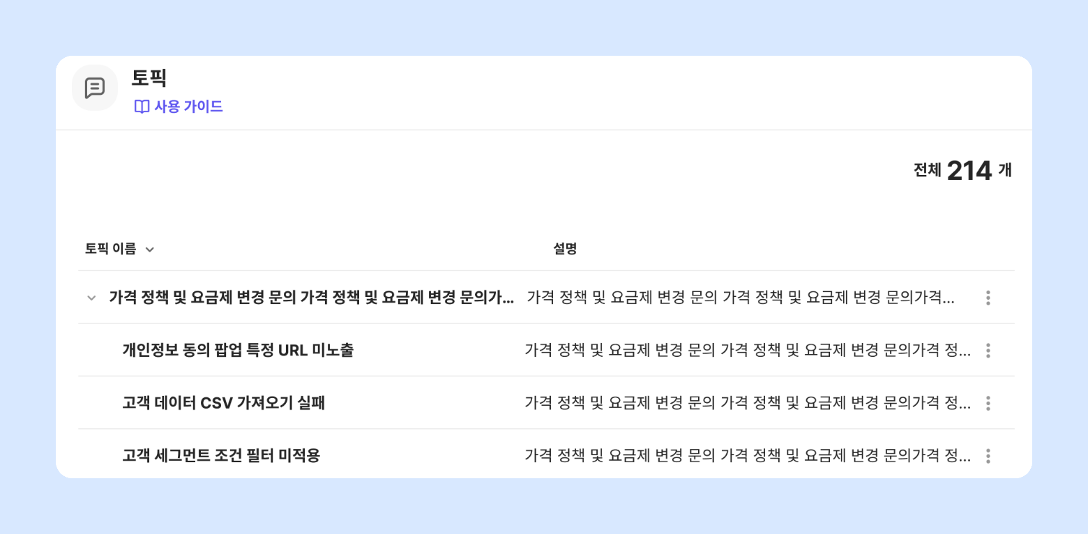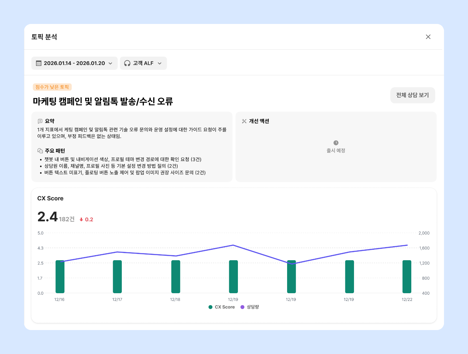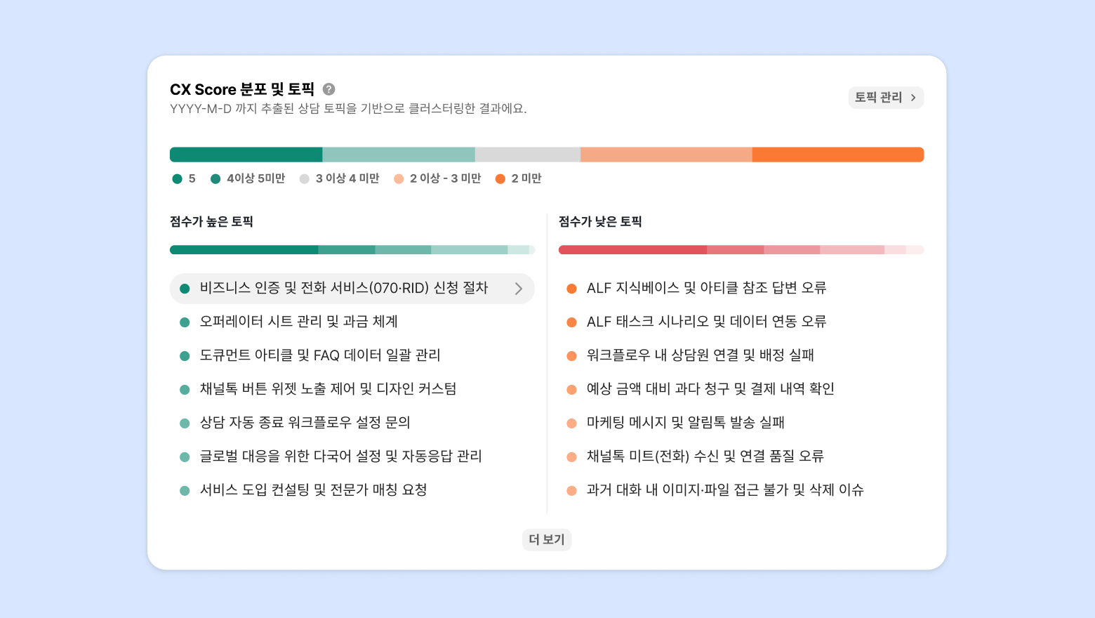 상담이 종료되면 AI가 비슷한 주제의 상담을 자동으로 묶어 토픽으로 분류하고, CX Score가 낮은 토픽을 한눈에 볼 수 있게 정리해줍니다. 수백 건의 상담을 하나씩 확인하지 않아도 돼요.