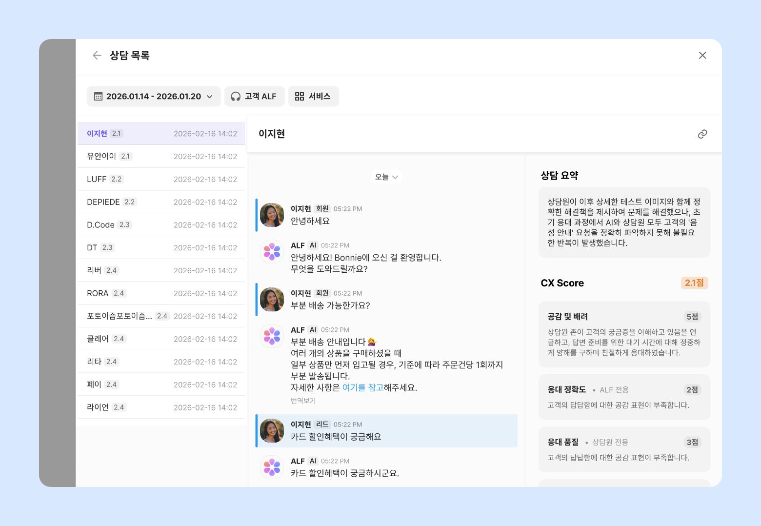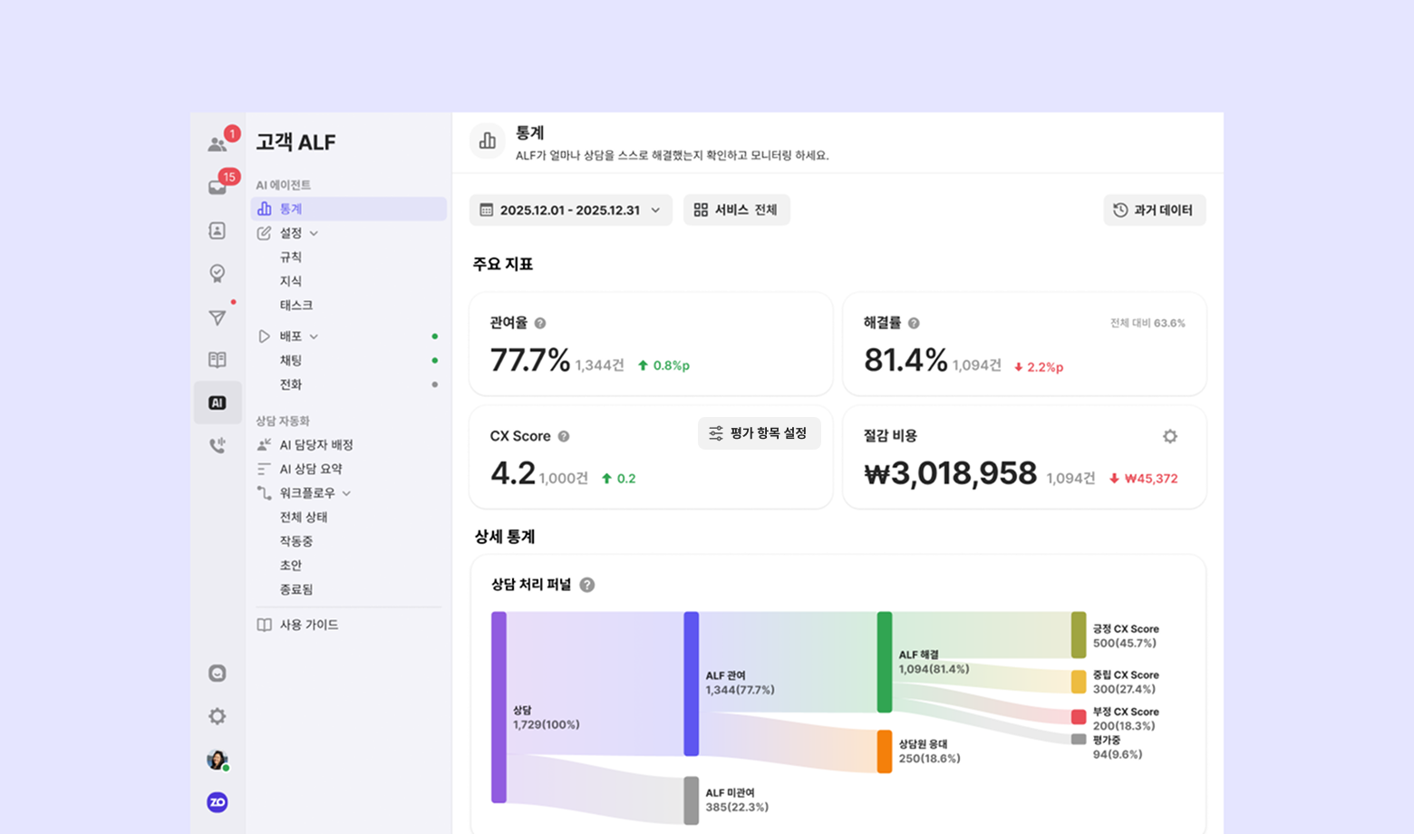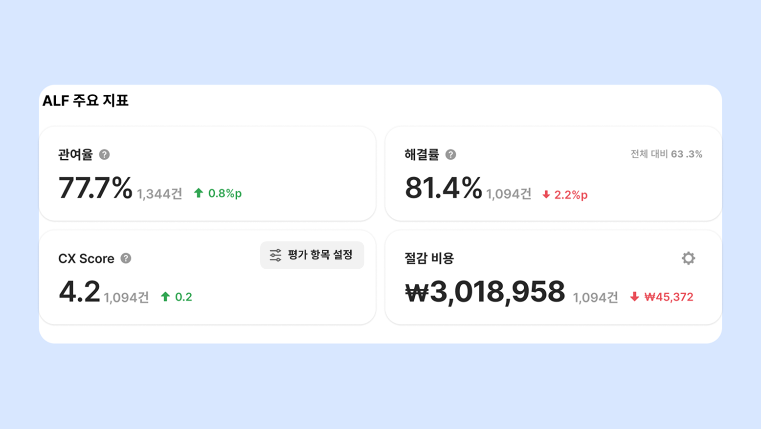ALF의 상담 관여 비율, 관여 해결률, CX 스코어, 그리고 ALF를 통해 절감된 비용 추산까지 한눈에 확인할 수 있는 통계 기능을 제공합니다.