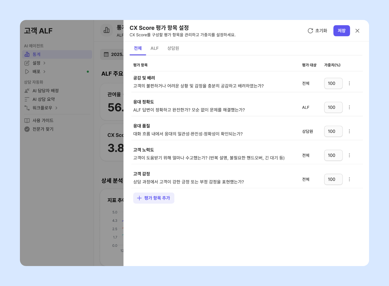 [채널 설정] - [AI] - [통계] - [ALF 주요 지표] - [CX Score] - [평가 항목 설정]으로 이동합니다.