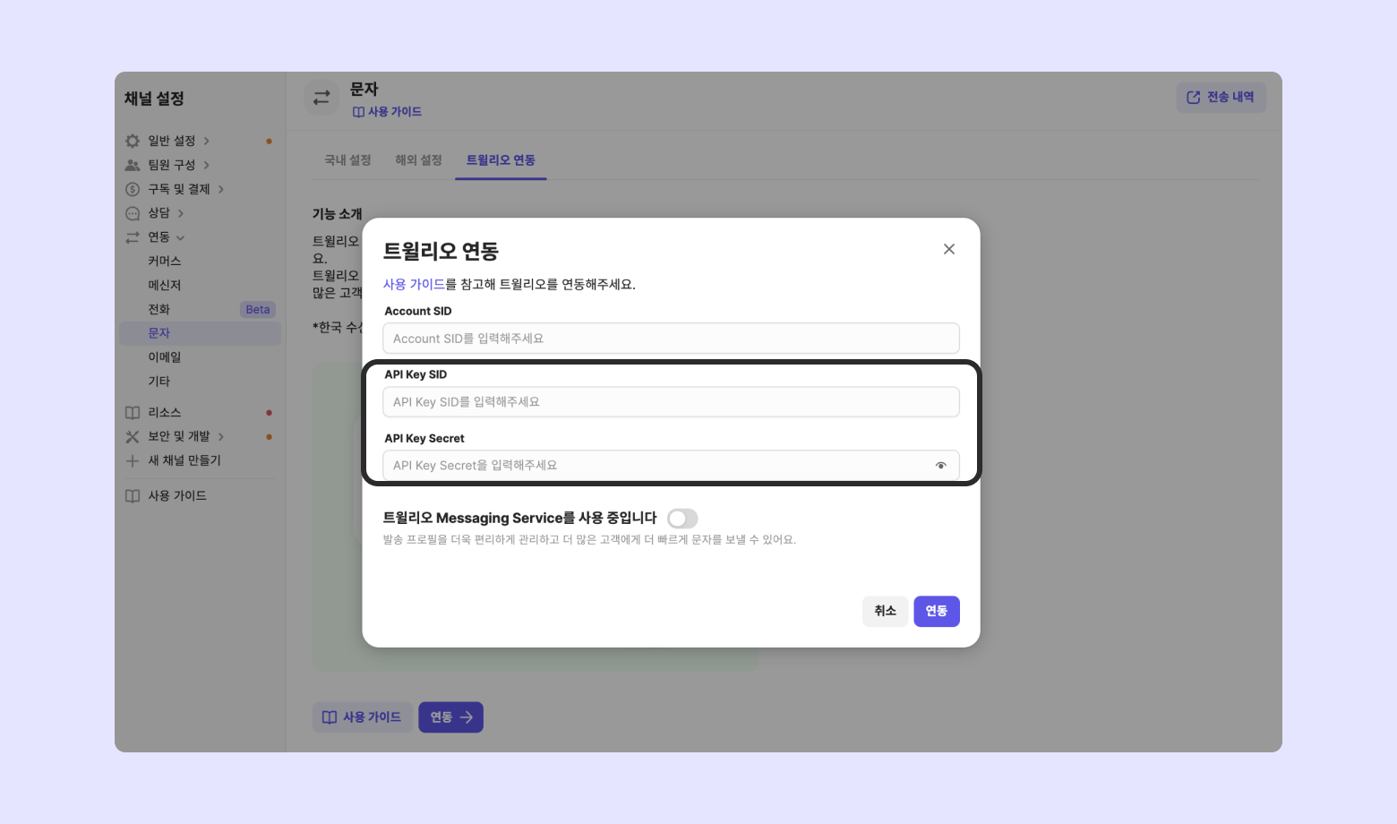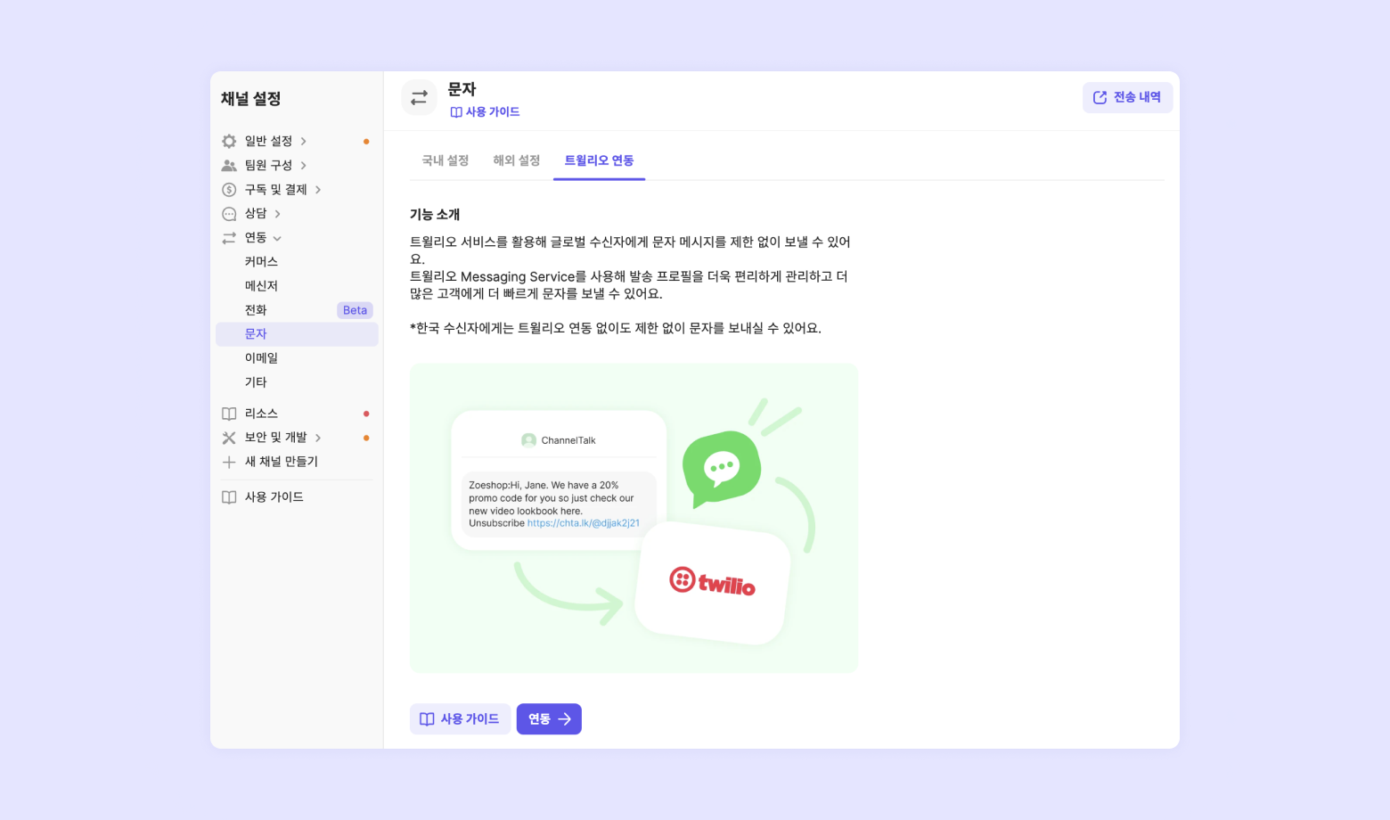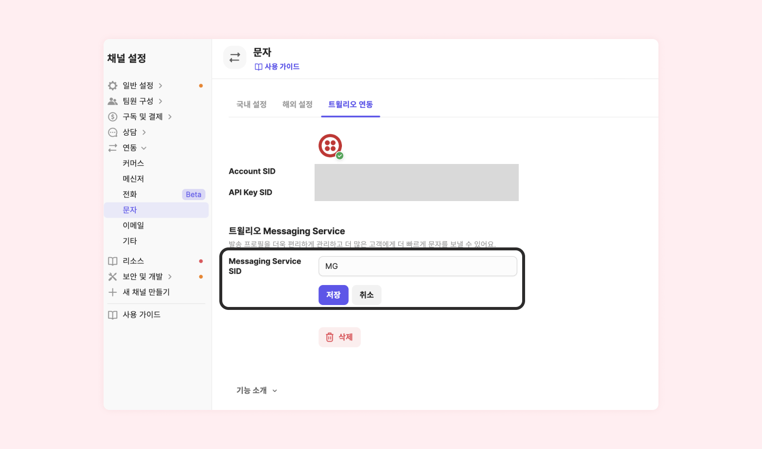 [채널 설정] - [연동] - [문자] - [트윌리오 연동] - [연동]