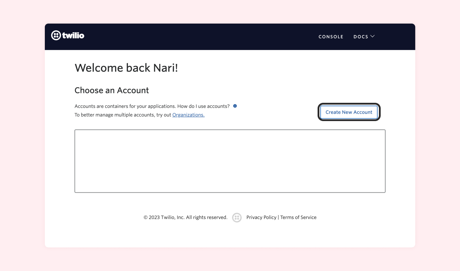 로그인 후, Account 목록 페이지에서 [Create New Account] 버튼을 통해 새로운 트윌리오 계정을 생성해주세요.