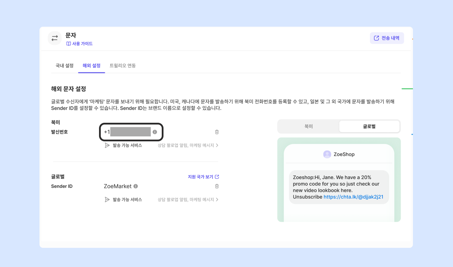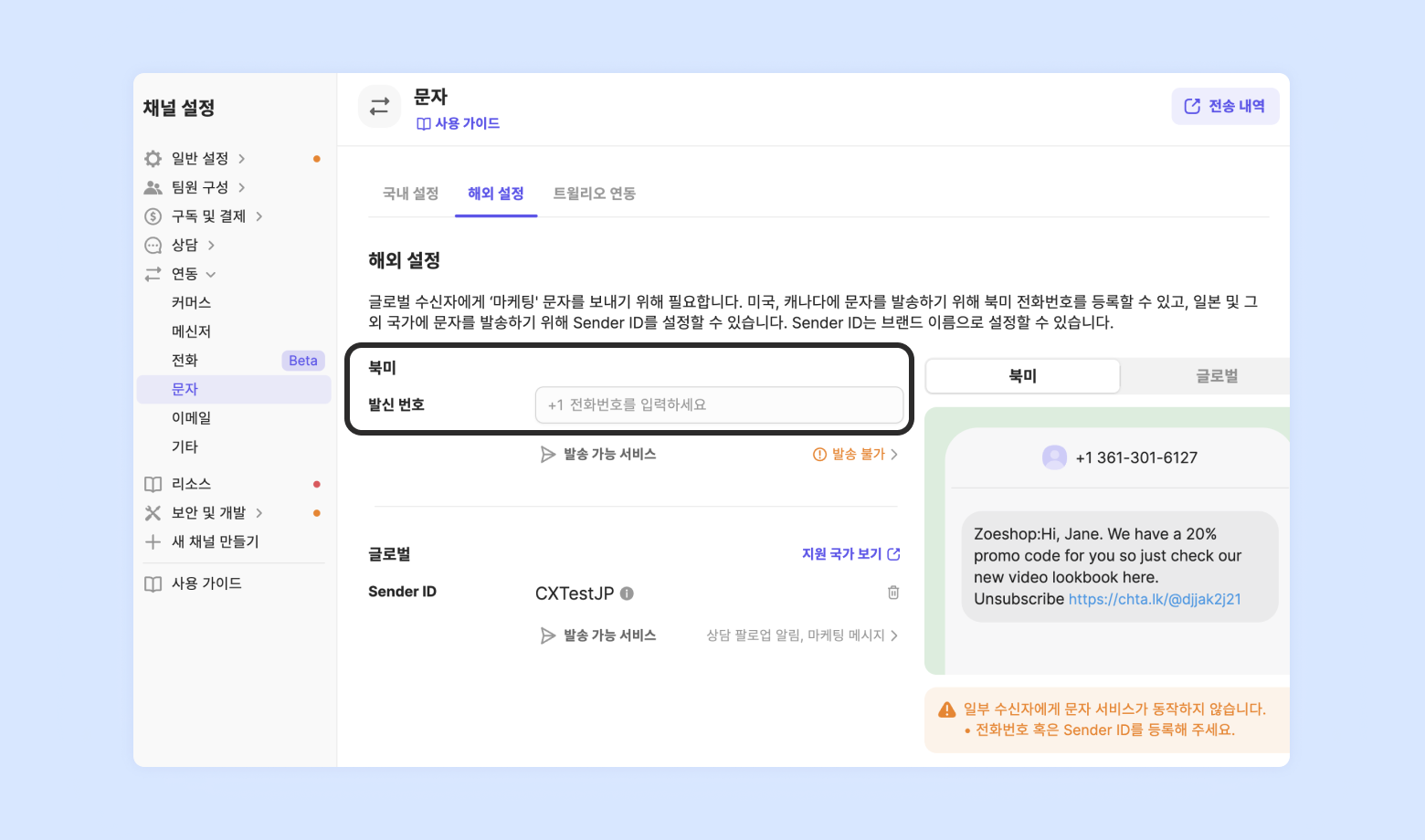 [채널 설정] - [연동] - [문자] 페이지에서, [해외 설정]