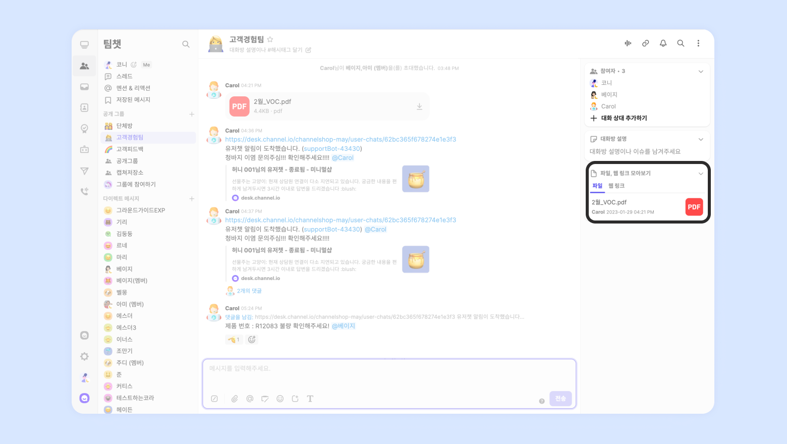 또한, 새로운 팀원이 입사할 때마다 일일이 대화방에 초대하거나, 퇴사한 팀원이 스스로 나가지 않으면 매번 새로운 대화방을 만들어야했지만! 채널톡은 복잡한 절차 없이 팀원, 관리자 모두 대화방에 자유롭게 들어가거나 내보낼 수 있으며, 퇴사한 팀원이라면 자동으로 대화방에서 삭제됩니다.
