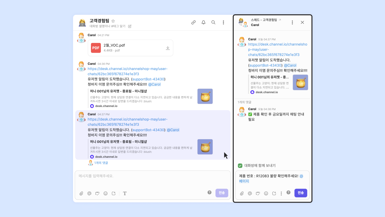 업무 히스토리를 한 눈에 확인하고, 중요한 유저챗을 팀원들과 공유하며 논의하고 싶으신가요? 스레드, 유저챗의 내용을 링크로 팀원들과 공유하고 사이드 뷰를 통해 화면 이동 없이 한 번에 확인해보세요.
