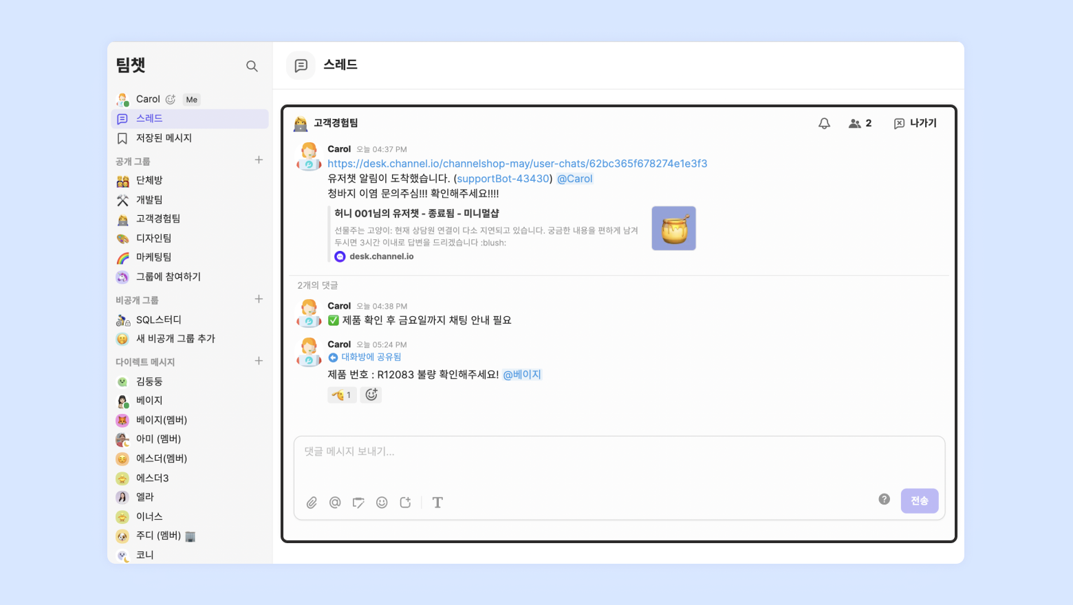 나와 관련된 중요한 업무 내용만 한 눈에 모아보고 알림을 받고 싶다면 스레드 기능을 이용해보세요. 멘션을 통해 팀원을 스레드에 참여시킬 수도 있고, 내가 관심 있는 업무 내용이라면 직접 스레드에 참여할 수도 있어요. 참여했다면? 활발히 이야기 하고, 간단한 리액션도 남겨보세요.