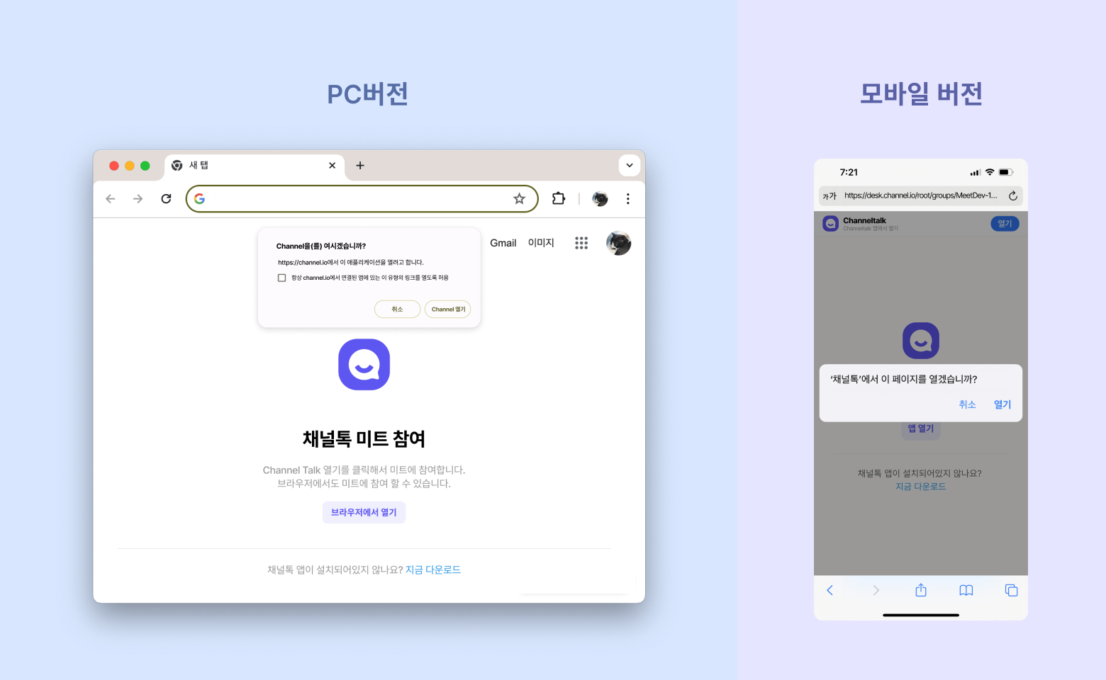 [열기]를 클릭해 채널톡 앱으로 접속할 수 있습니다. 앱을 바로 다운받을 수도 있고, 없다면 브라우저로도 접속 가능합니다.