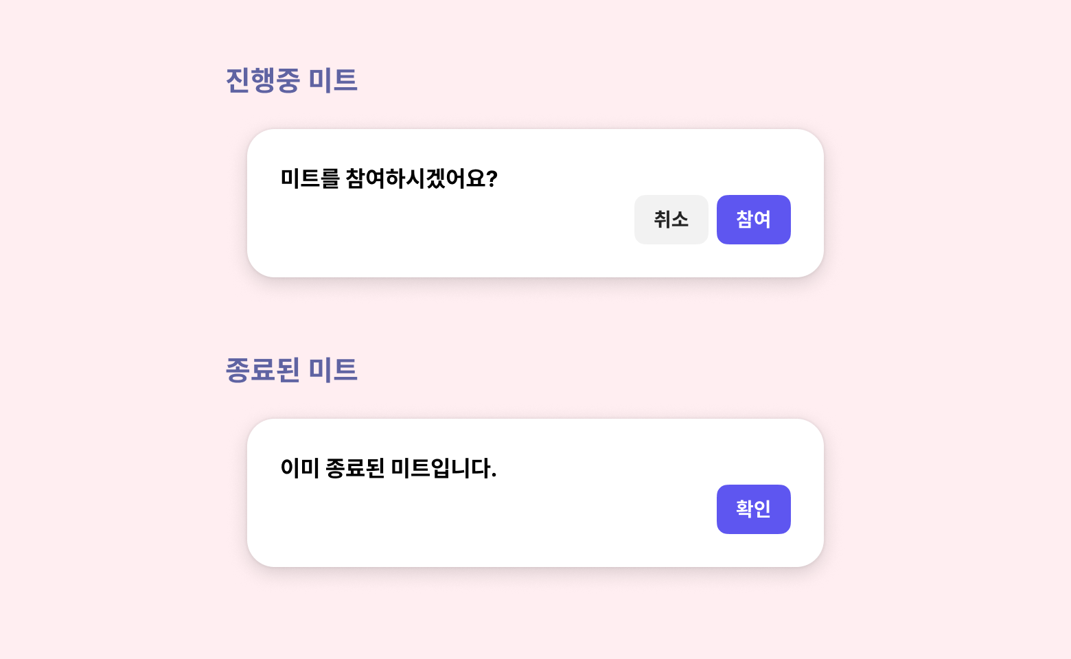 미트 진행중이라면 [참여]를 클릭해 미트 참여가 가능하고, 이미 종료되었다면 “이미 종료된 미트입니다” 팝업이 뜹니다.