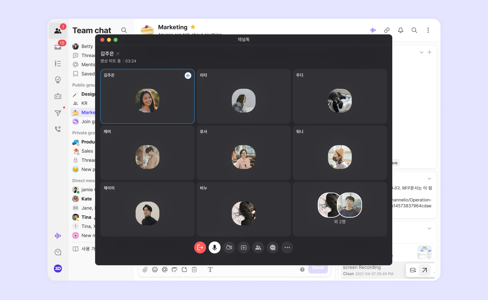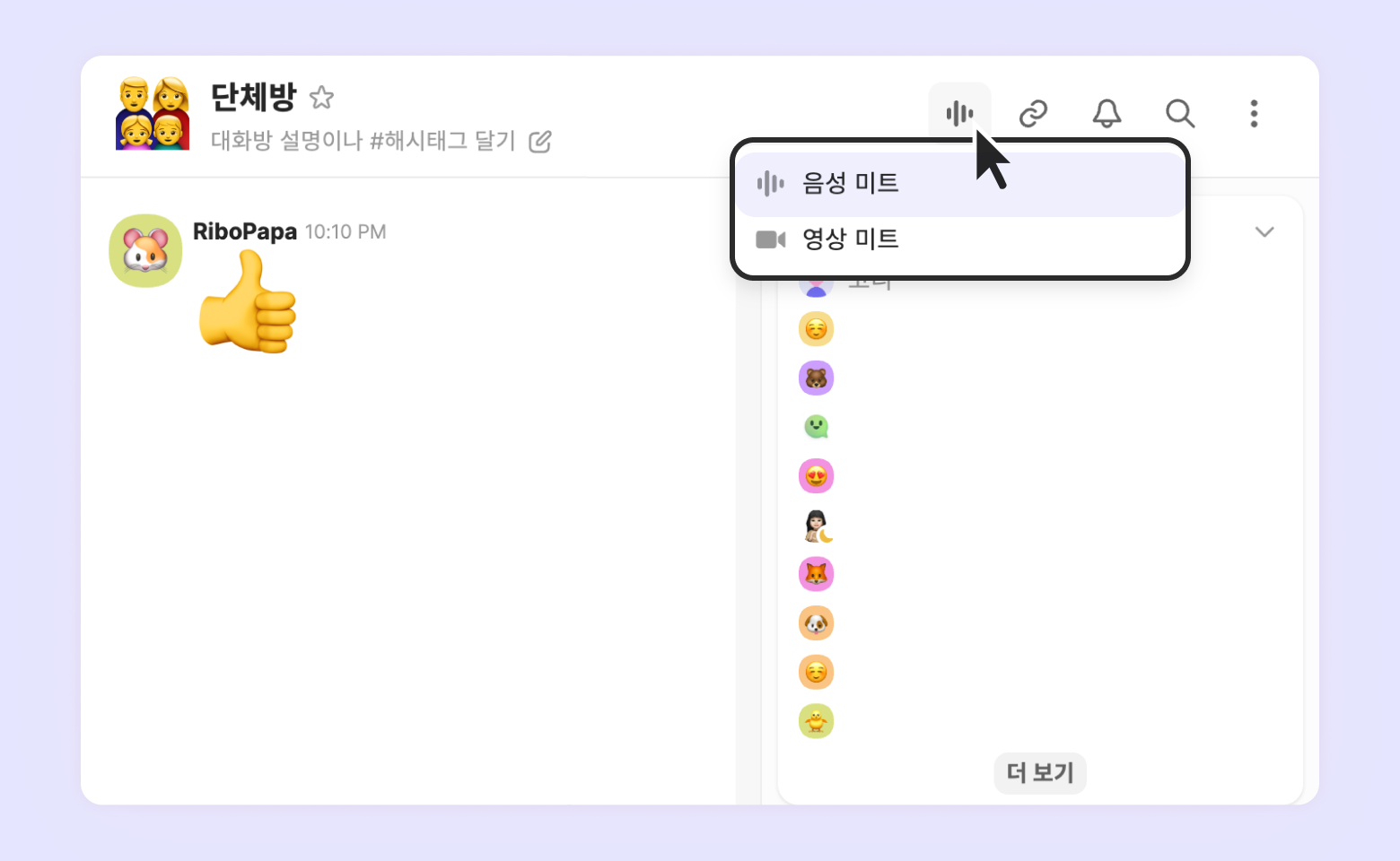 팀챗 상단의 [미트] - [음성 미트] 버튼을 눌러 여러 매니저들과 음성으로 회의를 할 수 있어요. 비디오 버튼을 눌러 화상 회의로 바로 전환도 가능합니다.