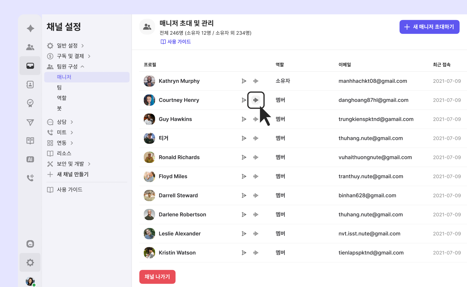 경로: 채널 설정 → 팀원 구성 → 매니저
