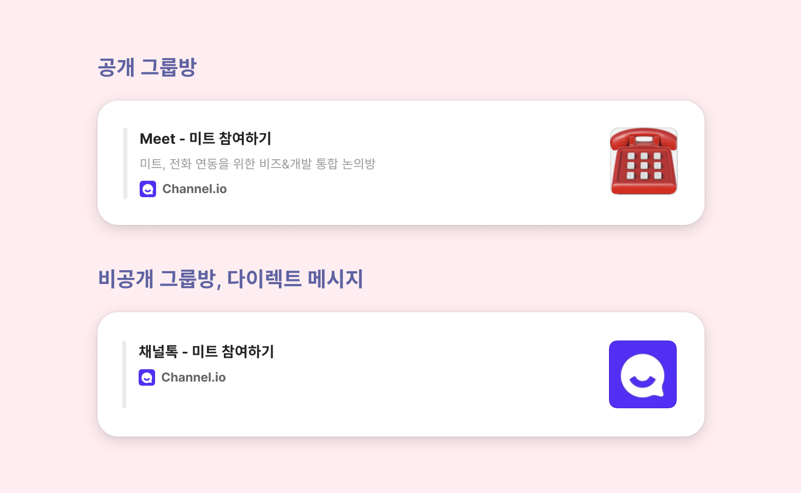 비공개 그룹방, 다이렉트 메시지: 채널 이름으로 표기됩니다.