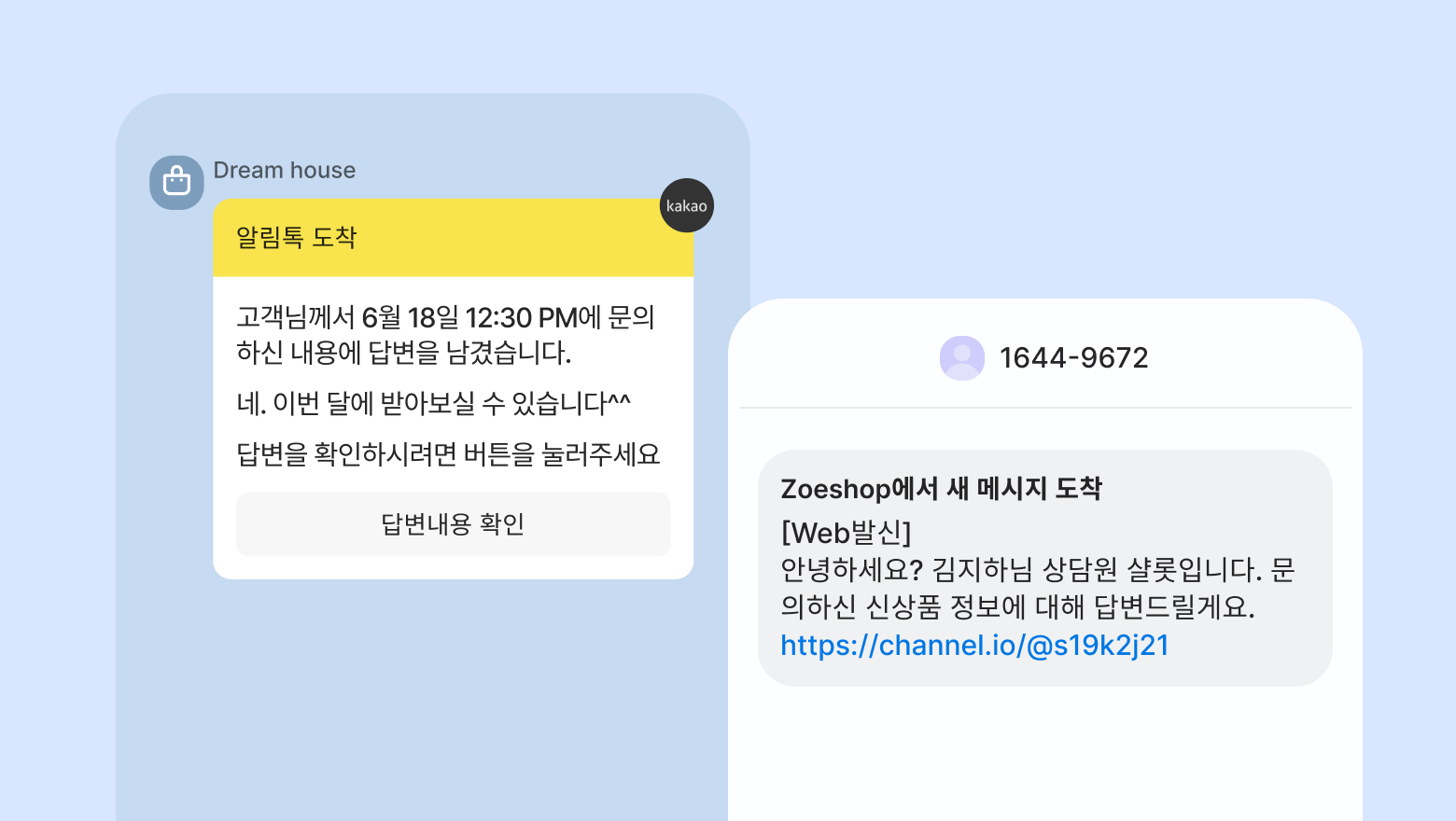 상담 중 오프라인 상태가 된 고객에게 보내는 답변 알림은 알림톡 연동이 되어 있다면 알림톡이 우선적으로 발송되고, 발송에 실패한 경우 자동으로 문자가 발송됩니다.