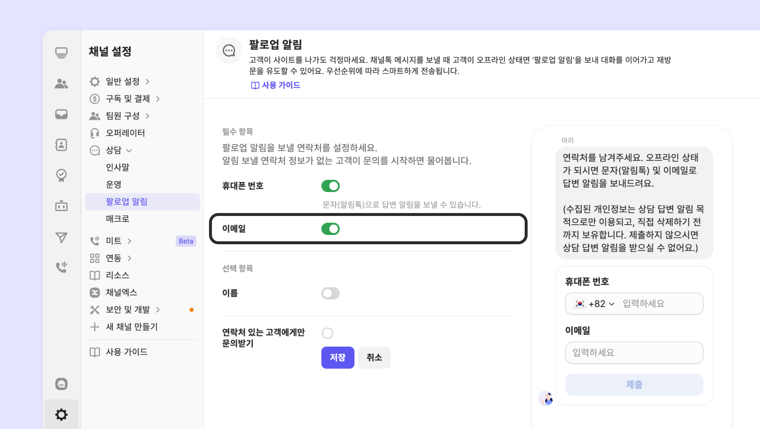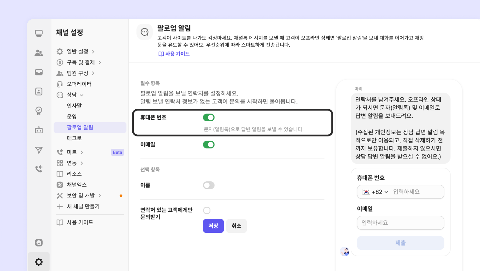 [채널 설정] - [상담] - [팔로업 알림] 에서 ‘휴대폰 번호'를 ON 해주세요.