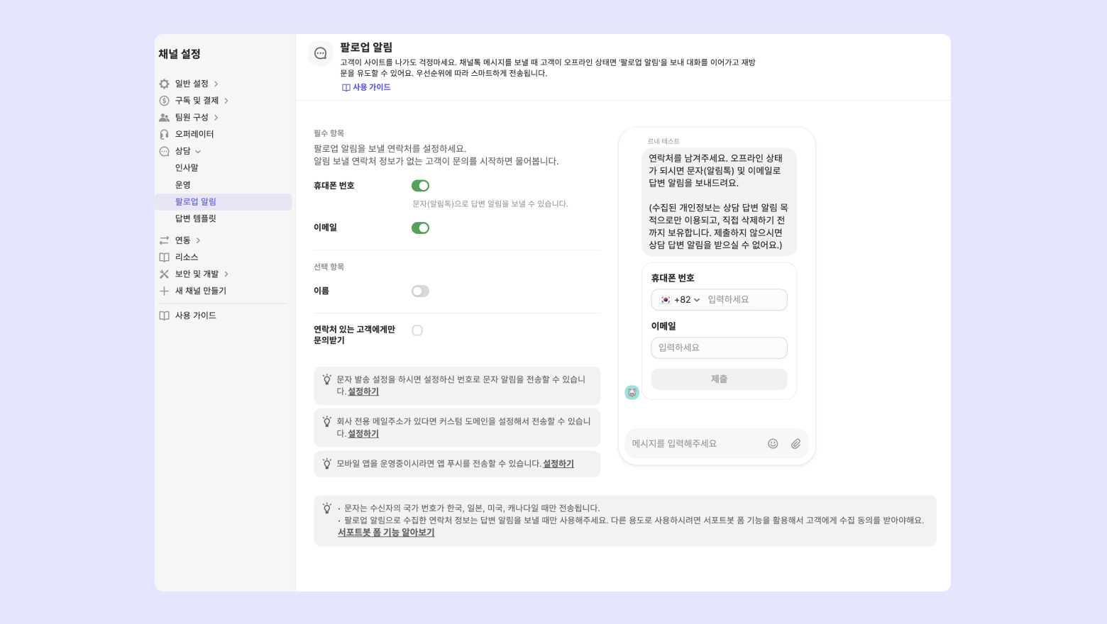 휴대폰 번호를 활성화 할 경우, 알림톡 또는 문자로 팔로업 알림이 전송되도록 자동으로 설정됩니다.