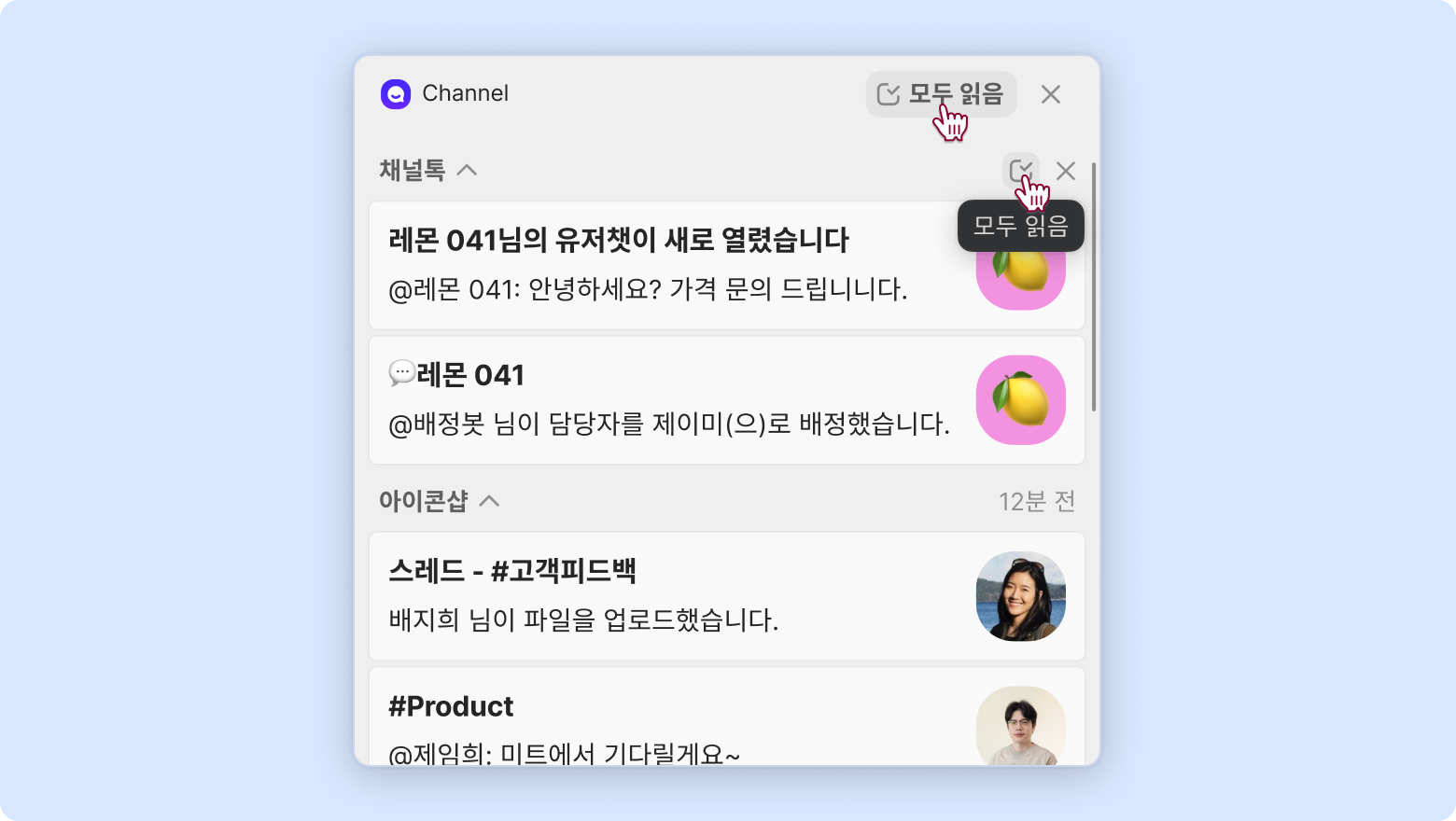‘모두 읽음’ 버튼을 클릭하여 수신한 전체 메시지를 읽기 처리하고 알림메시지를 닫을 수 있습니다. 또한 각 채널별로 그룹화된 메세지를 ‘모두 읽음’ 처리 할 수 있습니다.