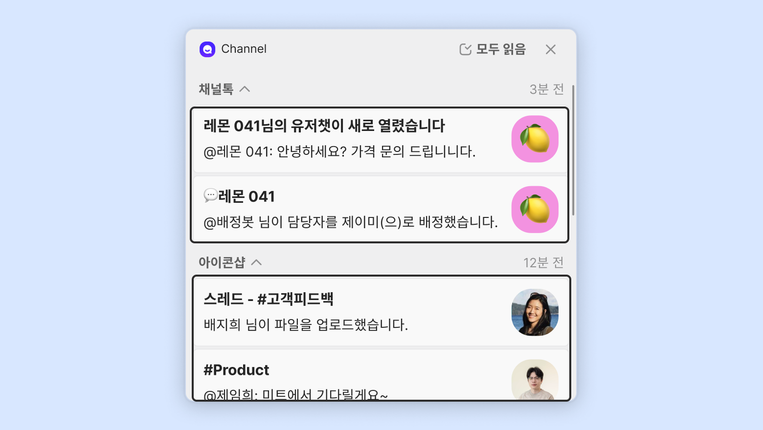 각 채널에 들어온 팀챗/수신함 알림을 하나로 묶어서, 메세지를 채널별로 구분하여 보여줍니다.
