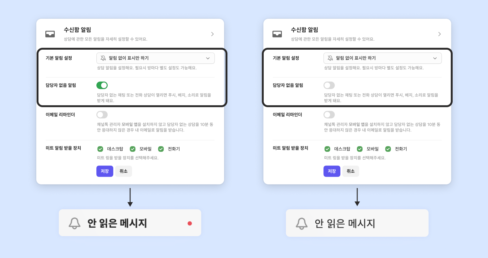 단, 전화의 경우 '담당자 없음 알림'을 켜더라도 상담 유형에 전화가 없는 경우 알림을 받을 수 없으니 담당자 없는 전화 알림을 받으려면 상담 유형에서 전화를 켜주세요.