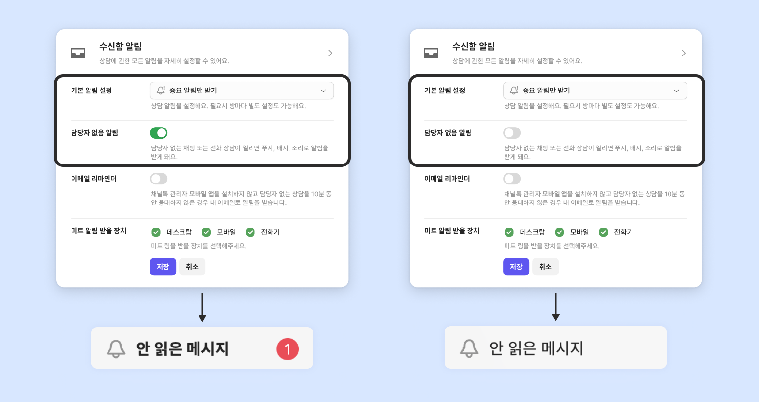 담당자 없음 알림을 켜면 담당자 없는 새 채팅 또는 전화 상담이 들어올 때, 푸시, 배지, 소리로 알림을 받을 수 있어요.