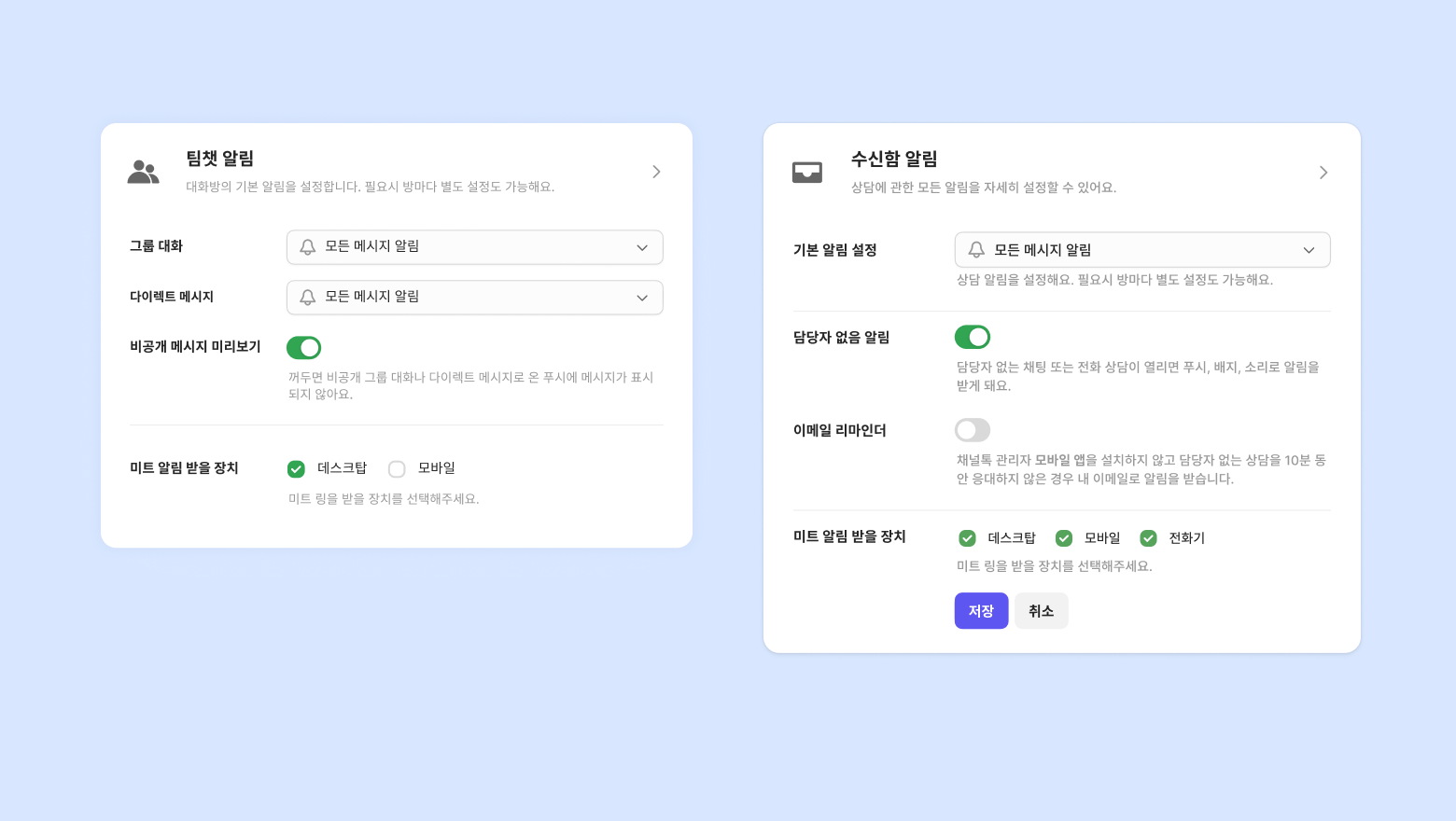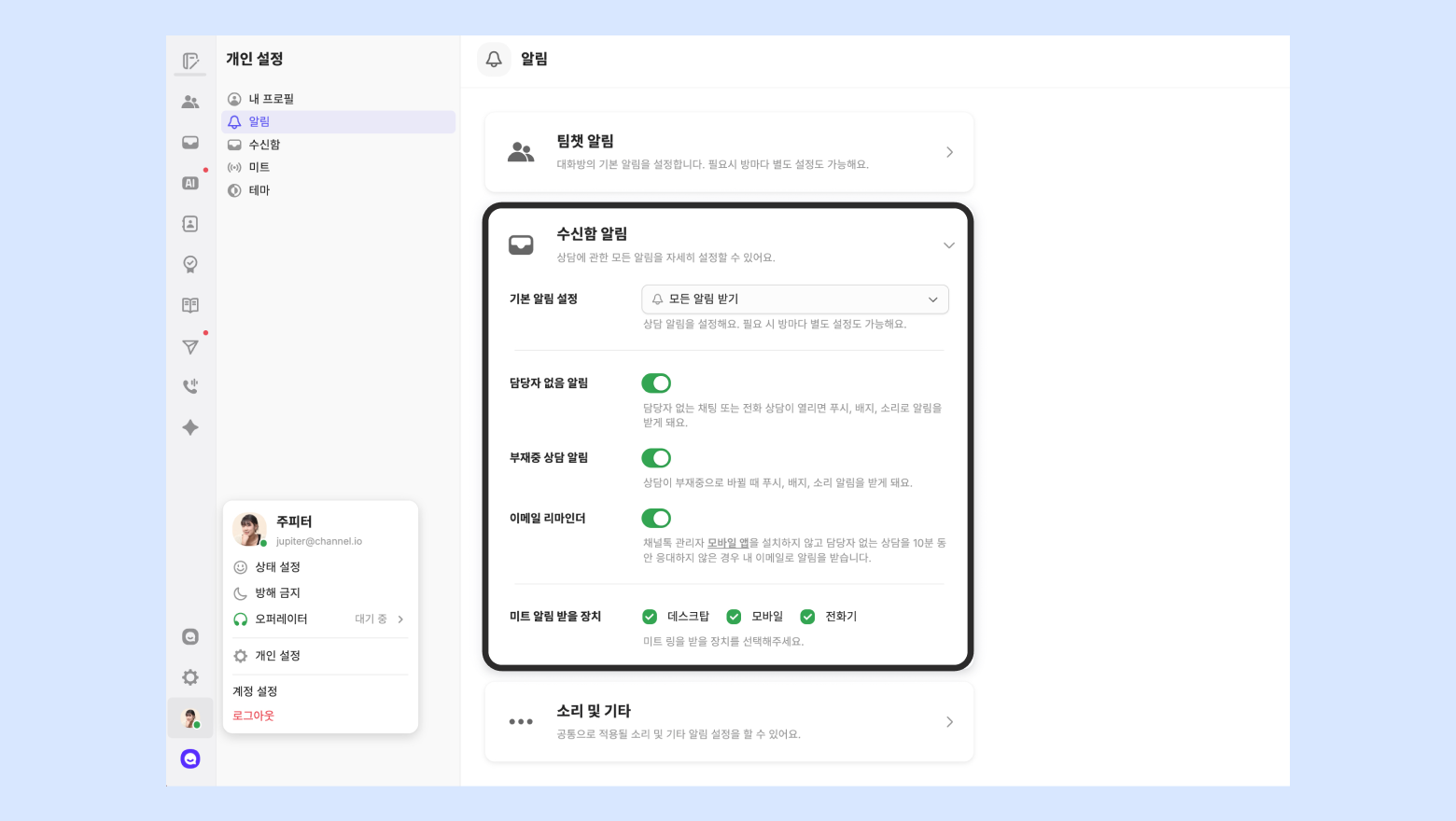 팀챗과 수신함을 구분하여 각각 알림 설정이 가능해요.